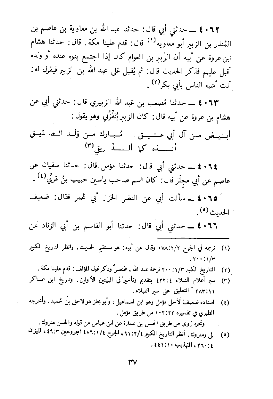 4062 - حَدثنِي أبي قَالَ حَدثنَا عبد الله بْنُ مُعَاوِيَةَ بْنِ عَاصِمِ بْنِ الْمُنْذِرِ بْنِ الزُّبَيْرِ أَبُو مُعَاوِيَةَ قَالَ قَدِمَ عَلَيْنَا مَكَّةَ قَالَ حَدَّثَنَا هِشَامُ بْنُ عُرْوَةَ عَنْ أَبِيهِ أَنَّ الزُّبَيْرَ بْنَ الْعَوَّامِ كَانَ إِذَا اجْتَمَعَ بَنُوهُ عِنْدَهُ أَوْ وَلَدُهُ أَقْبَلَ عَلَيْهِمْ فَذَكَرَ الْحَدِيثَ قَالَ ثُمَّ يُقْبِلُ عَلَى عَبْدِ اللَّهِ بْنِ الزُّبَيْرِ فَيَقُولُ لَهُ أَنْتَ أَشْبَهُ النَّاسِ بِأَبِي بَكْرٍ