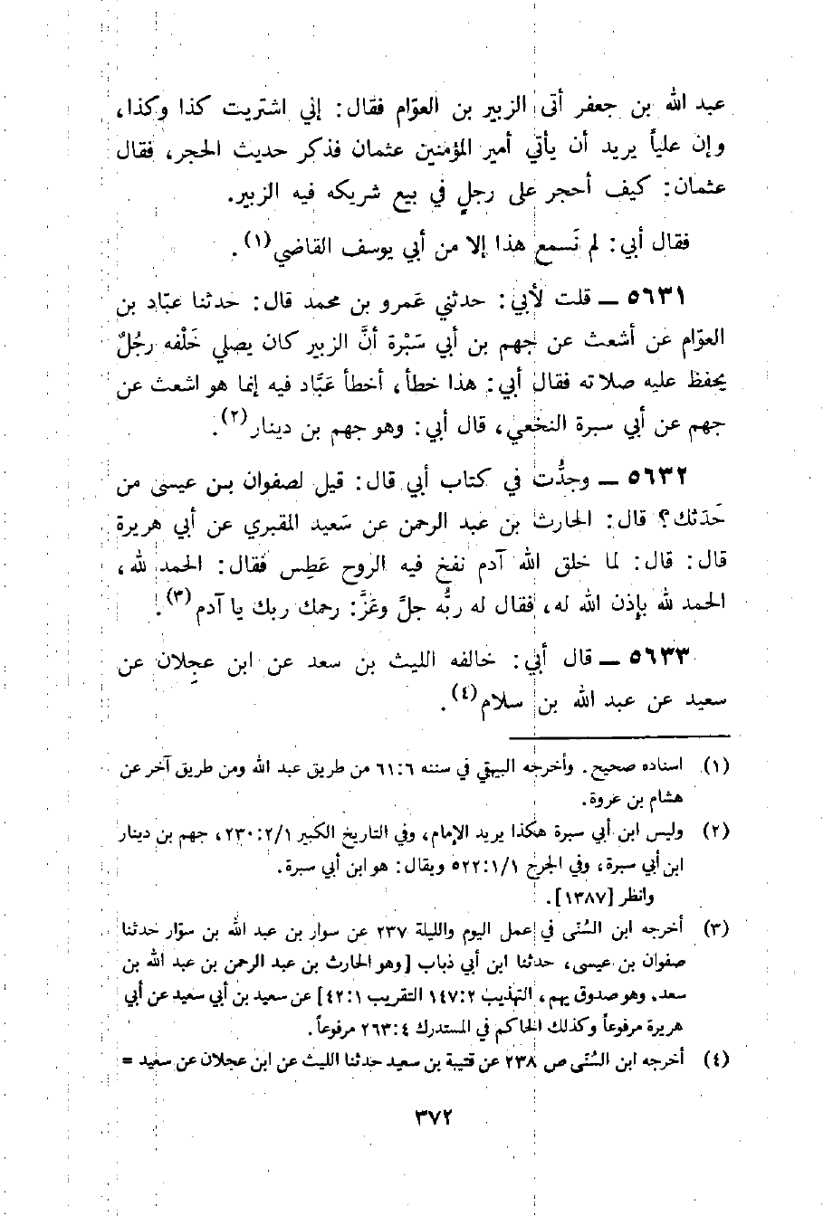 5631 - قلت لأبي حَدثنِي عَمْرو بن مُحَمَّد قَالَ حَدثنَا عباد بن الْعَوام عَن أَشْعَث عَن جهم بن أبي سُبْرَة أَن الزبير كَانَ يُصَلِّي خَلفه رجل يحفظ عَلَيْهِ صلَاته فَقَالَ أبي هَذَا خطأ أَخطَأ عباد فِيهِ إِنَّمَا هُوَ أَشْعَث عَن جهم عَن أبي سُبْرَة النَّخعِيّ قَالَ أبي وَهُوَ جهم بن دِينَار