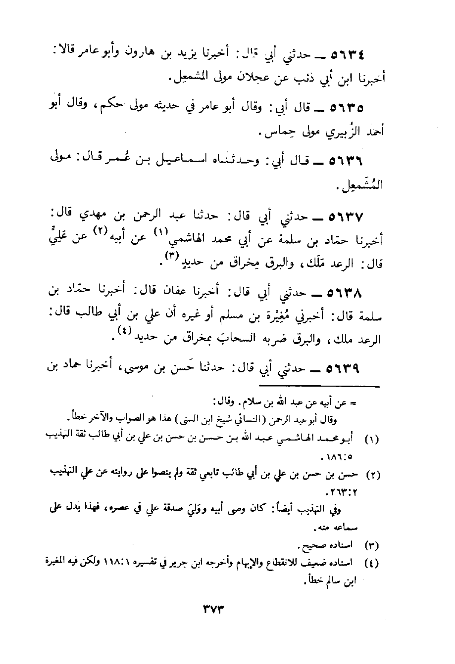 5637 - حَدثنِي أبي قَالَ حَدثنَا عبد الرَّحْمَن بن مهْدي قَالَ أخبرنَا حَمَّاد بن سَلمَة عَنْ أَبِي مُحَمَّدٍ الْهَاشِمِيِّ عَنْ أَبِيهِ عَنْ عَلِيٍّ قَالَ الرَّعْدُ مَلَكٌ وَالْبَرْقُ مِخْرَاقٌ مِنْ حَدِيدٍ