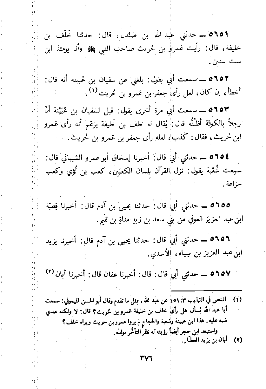 5653 - سَمِعت أبي مرّة أُخْرَى يَقُول قيل لِسُفْيَان بن عُيَيْنَة إِن رجلا بِالْكُوفَةِ أَظُنهُ قَالَ يُقَال لَهُ خلف بن خَليفَة يزْعم أَنه رأى عَمْرو بن حُرَيْث فَقَالَ كذب لَعَلَّه رأى جَعْفَر بن عَمْرو بن حُرَيْث