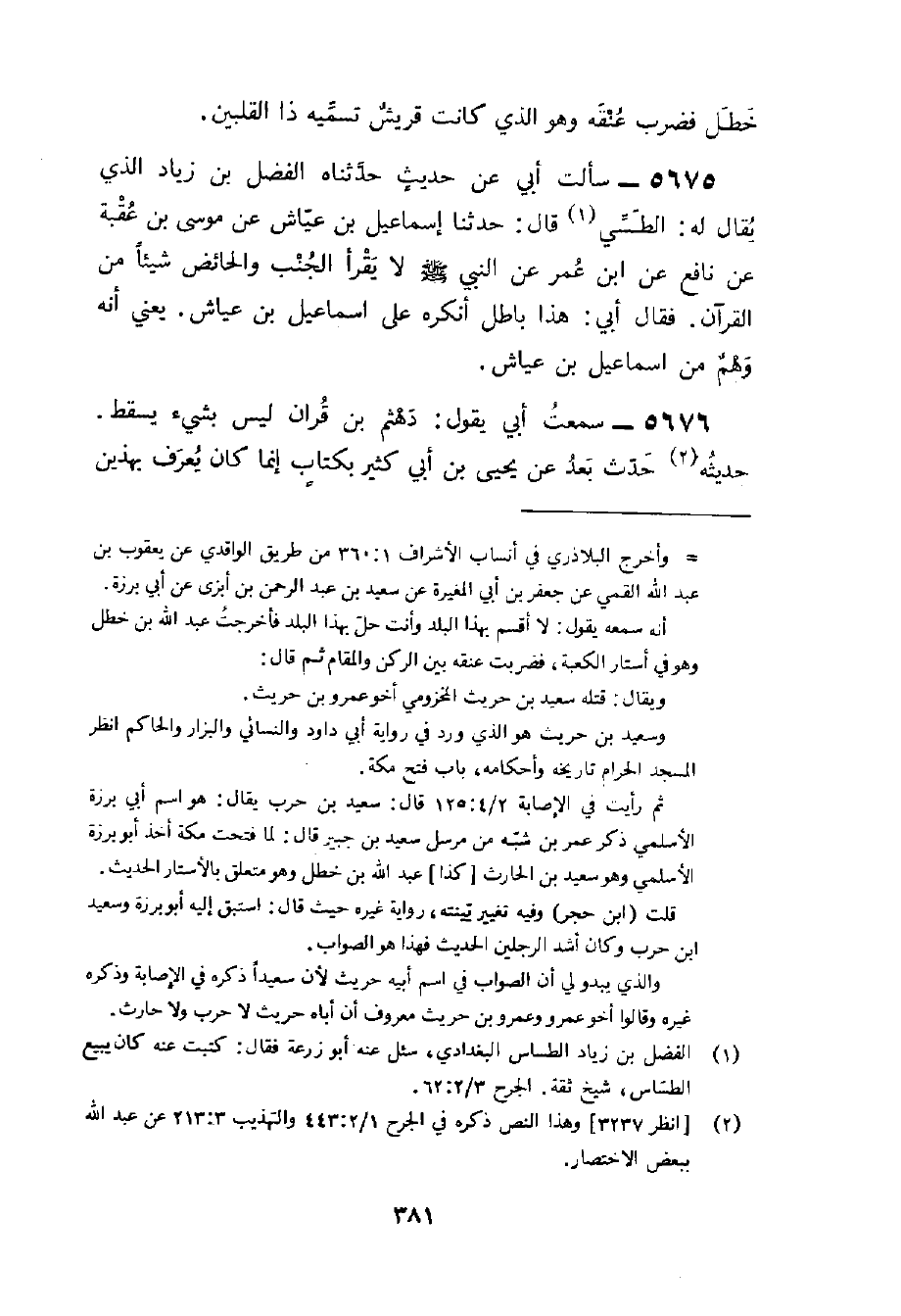 5675 - سَأَلْتُ أَبِي عَنْ حَدِيثٍ حَدَّثَنَاهُ الْفَضْلُ بْنُ زِيَادٍ الَّذِي يُقَالُ لَهُ الطسي قَالَ حَدثنَا إِسْمَاعِيل بن عَيَّاش عَنْ مُوسَى بْنِ عُقْبَةَ عَنْ نَافِع عَن بن عُمَرَ عَنِ النَّبِيِّ صَلَّى اللَّهُ عَلَيْهِ وَسَلَّمَ لَا يَقْرَأُ الْجُنُبُ وَالْحَائِضُ شَيْئًا مِنَ الْقُرْآنِ فَقَالَ أَبِي هَذَا بَاطِلٌ أَنْكَرَهُ عَلَى إِسْمَاعِيلَ بْنِ عَيَّاشٍ يَعْنِي أَنَّهُ وَهْمٌ مِنْ إِسْمَاعِيلَ بْنِ عَيَّاشٍ