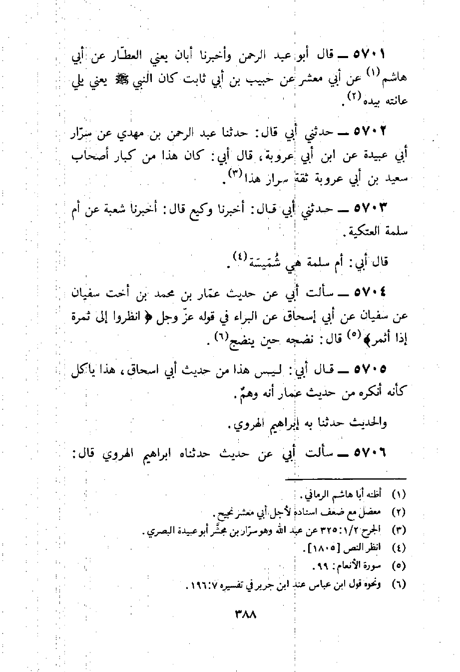 5704 - سَأَلْتُ أَبِي عَنْ حَدِيثِ عمار بن مُحَمَّد بن أُخْتِ سُفْيَانَ عَنْ سُفْيَانَ عَنْ أَبِي إِسْحَاقَ عَنِ الْبَرَاءِ فِي قَوْلِهِ عَزَّ وَجَلَّ انْظُرُوا إِلَى ثَمَرَة إِذا أثمر قَالَ نُضْجَهُ حِينَ يَنْضُجُ