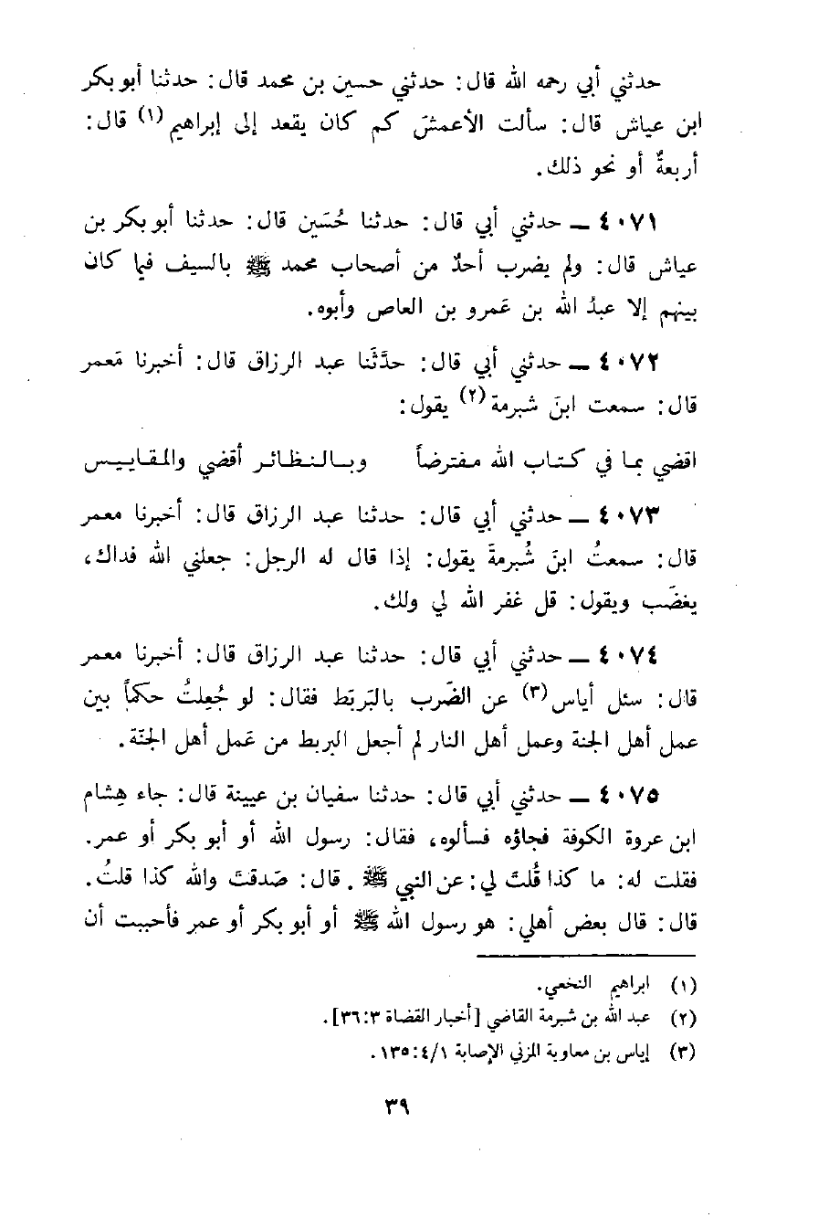 4072 - حَدثنِي أبي قَالَ حَدثنَا عبد الرَّزَّاق قَالَ أخبرنَا معمر قَالَ سَمِعت بن شبْرمَة يَقُول ... أَقْْضِي بِمَا فِي كتاب الله مفترضا ... وبالنظائر أَقْْضِي والمقاييس ...