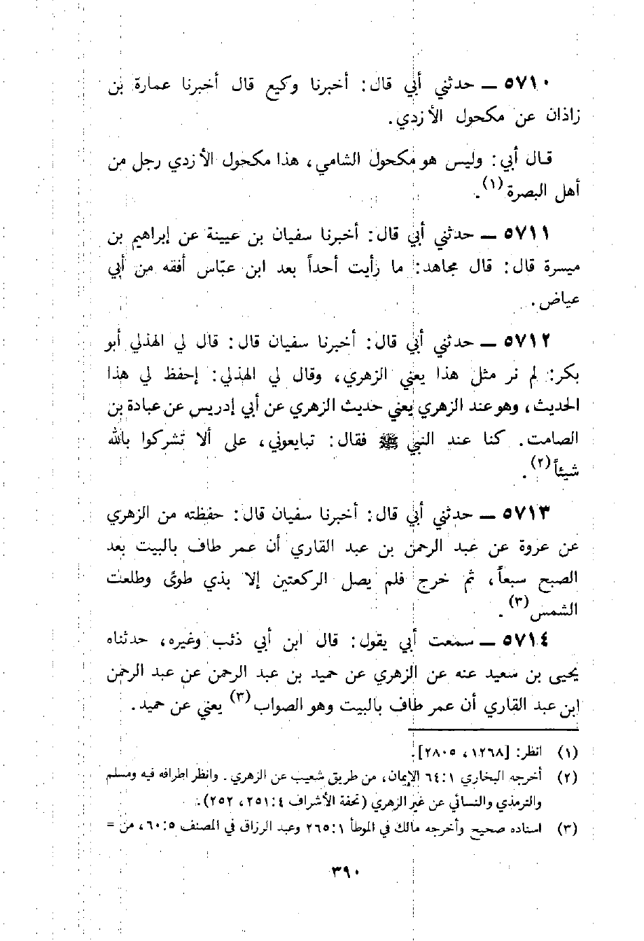 5713 - حَدثنِي أبي قَالَ أخبرنَا سُفْيَانُ قَالَ حَفِظْتُهُ مِنَ الزُّهْرِيِّ عَنْ عُرْوَةَ عَنْ عَبْدِ الرَّحْمَنِ بْنِ عَبْدِ الْقَارِي أَنَّ عُمَرَ طَاف بِالْبَيْتِ بعد الصُّبْح سبعا ثُمَّ خَرَجَ فَلَمْ يُصَلِّ الرَّكْعَتَيْنِ إِلا بِذِي طُوًى وَطَلَعَتِ الشَّمْسُ