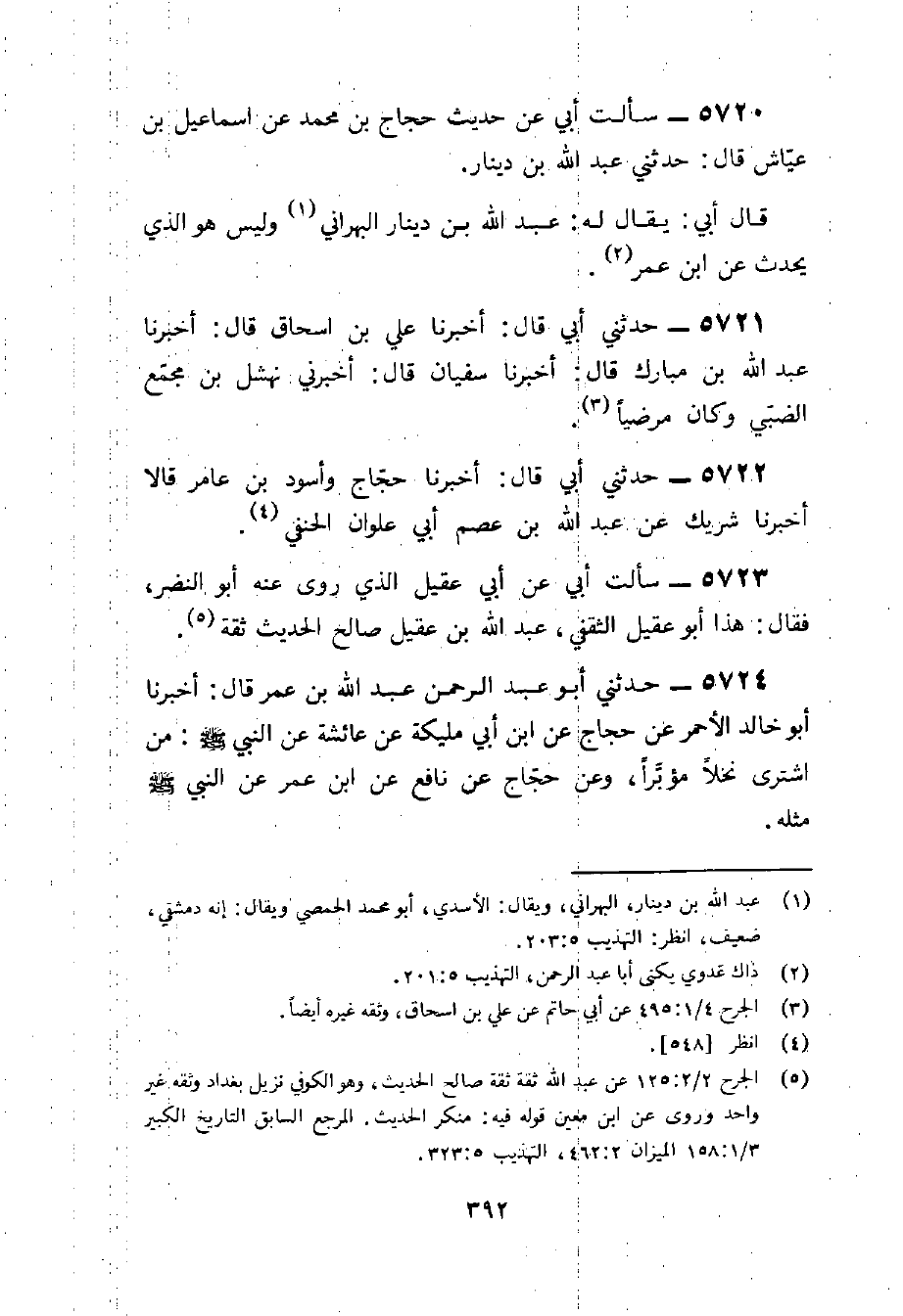 5720 - سَأَلت أبي عَن حَدِيث حجاج بن مُحَمَّد عَن إِسْمَاعِيل بن عَيَّاش قَالَ حَدثنِي عبد الله بن دِينَار قَالَ أبي يُقَال لَهُ عبد الله بن دِينَار البهراني وَلَيْسَ هُوَ الَّذِي يحدث عَن بن عمر