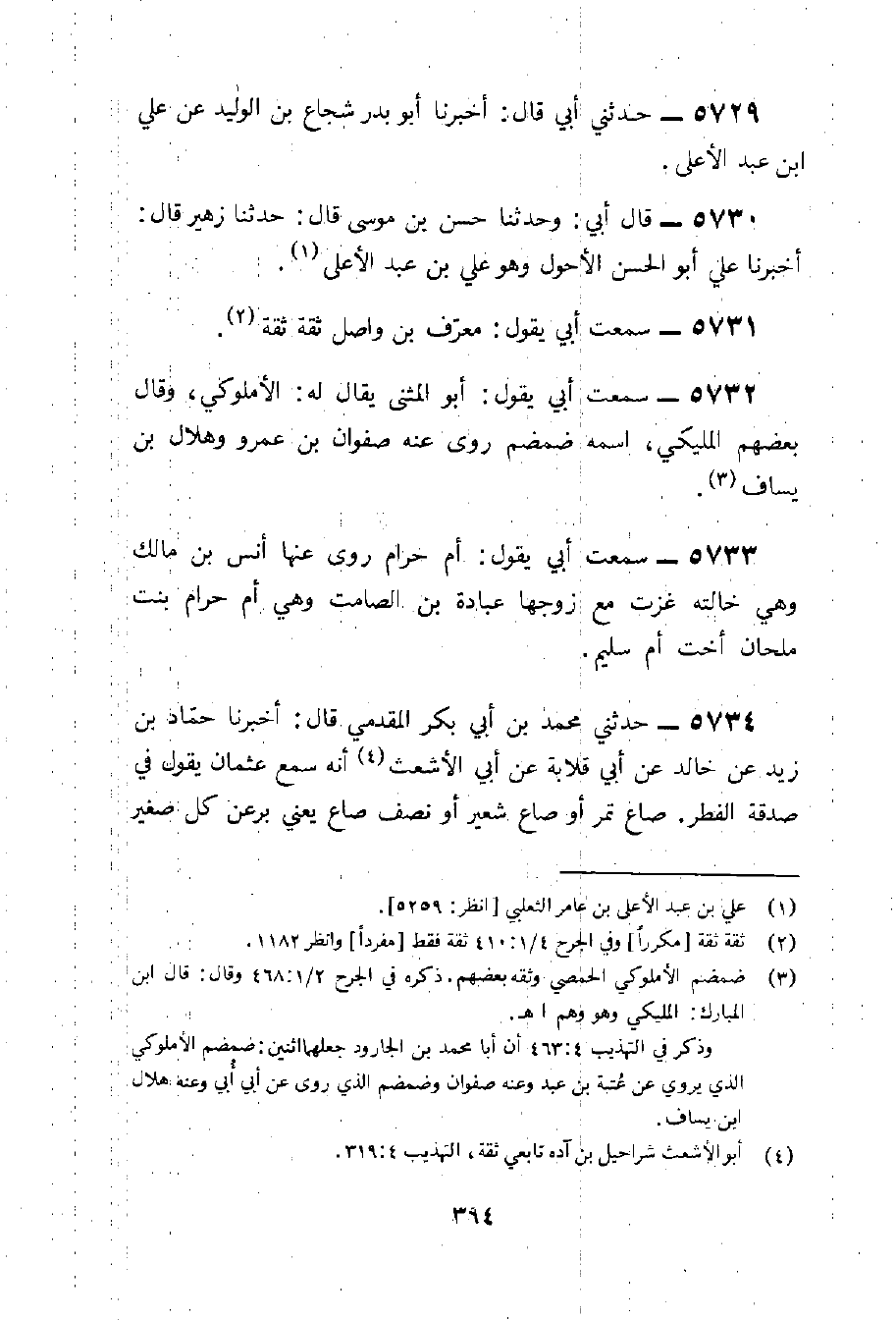 5734 - حَدَّثَنِي مُحَمَّدُ بن أبي بكر الْمقدمِي قَالَ أخبرنَا حَمَّاد بن زيد عَن خَالِد عَن أبي قلَابَة عَن أبي الْأَشْعَثِ أَنَّهُ سَمِعَ عُثْمَانَ يَقُولُ فِي صَدَقَةِ الْفِطْرِ صَاعُ تَمْرٍ أَوْ صَاعُ شَعِيرٍ أَوْ نِصْفُ صَاع يَعْنِي برعن كُلِّ صَغِيرٍ وَكَبِيرٍ وَذَكَرٍ وَأُنْثَى حُرٍّ أَوْ مَمْلُوكٍ فَحَدَّثْتُ بِهَذَا الحَدِيث أبي فَقَالَ أخبرنَا سُلَيْمَان بن حَرْب عَن حَمَّاد بن زيد عَن أَيُّوب بِهَذَا الْحَدِيثِ قَالَ أَبِي فَحَدَّثْتُ بِهِ عبد الرَّحْمَن بن مهْدي فَقَالَ أَخطَأ فَرَجَعت إِلَى سُلَيْمَان بعد فَرجع وَقَالَ هُوَ عَنْ خَالِدٍ