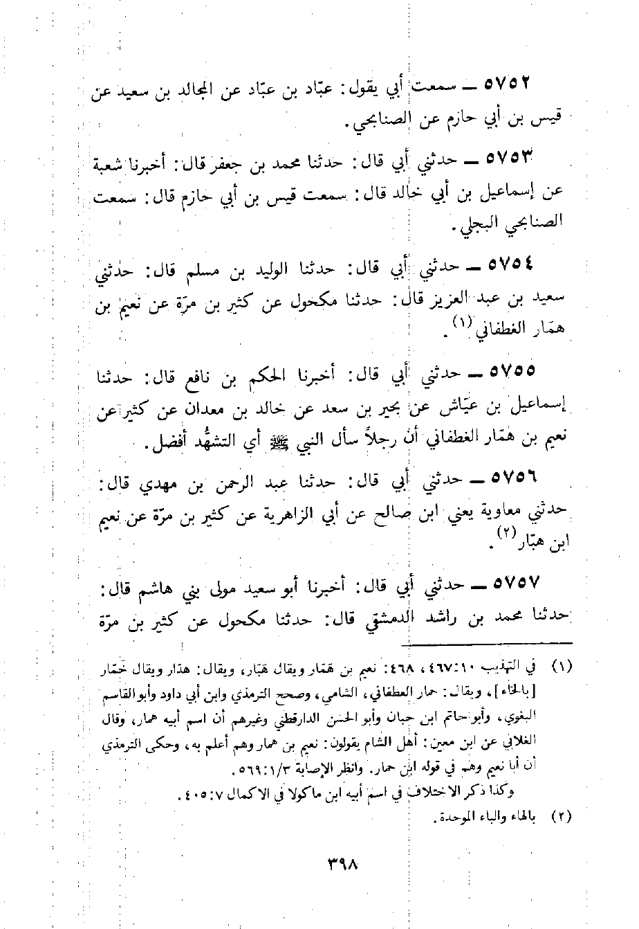 5754 - حَدثنِي أبي قَالَ حَدثنَا الْوَلِيد بن مُسلم قَالَ حَدثنِي سعيد بن عبد الْعَزِيز قَالَ حَدثنَا مَكْحُول عَن كثير بن مُرَّةَ عَنْ نُعَيْمِ بْنِ هَمَّارٍ الْغَطَفَانِي