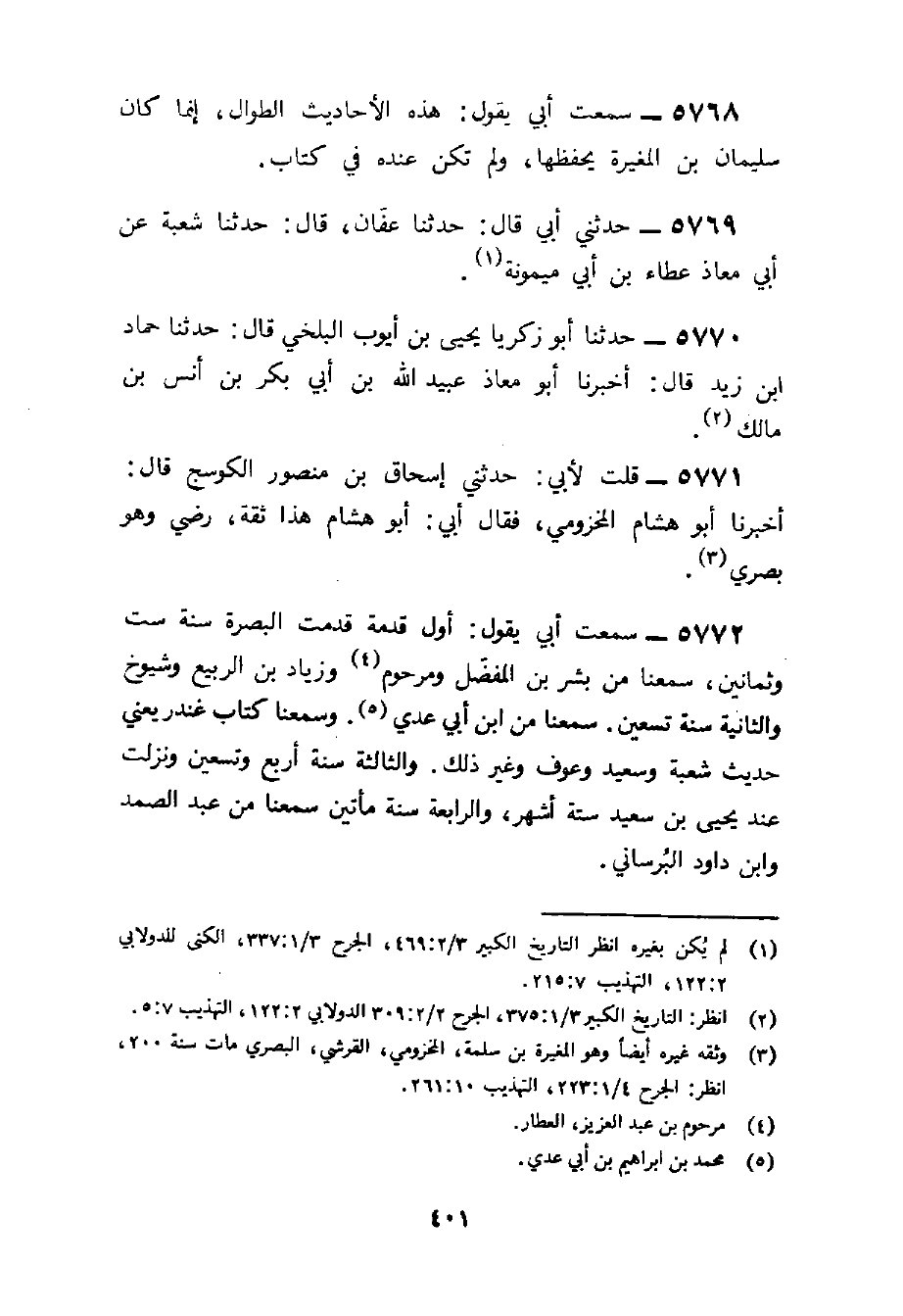 5772 - سَمِعت أبي يَقُول أول قدمة قدمت الْبَصْرَة سنة سِتّ وَثَمَانِينَ سمعنَا من بشر بن الْمفضل ومرحوم وَزِيَاد بن الرّبيع وشيوخ وَالثَّانيَِة سنة تسعين سمعنَا من بن أبي عدي وَسَمعنَا كتاب غنْدر يَعْنِي حَدِيث شُعْبَة وَسَعِيد وعَوْف وَغير ذَلِك وَالثَّالِثَة سنة أَربع وَتِسْعين وَنزلت عِنْد يحيى بن سعيد سِتَّة أشهر وَالرَّابِعَة سنة مِائَتَيْنِ سمعنَا من عبد الصَّمد وَابْن دَاوُد البرْسَانِي