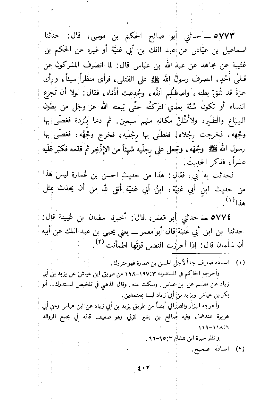 5773 - حَدثنِي أَبُو صَالح الحكم بن مُوسَى قَالَ حَدَّثَنَا إِسْمَاعِيلُ بْنُ عَيَّاش عَن عبد الْملك بن أَبِي غَنِيَّةَ أَوْ غَيْرُهُ عَنِ الْحَكَمِ بْنِ عُتَيْبَةَ عَنْ مُجَاهِدٍ عَنْ عَبْدِ اللَّهِ بْنِ عَبَّاسٍ قَالَ لَمَّا انْصَرَفَ الْمُشْرِكُونَ عَنْ قَتْلَى أُحُدٍ انْصَرَفَ رَسُولُ اللَّهِ صَلَّى اللَّهُ عَلَيْهِ وَسَلَّمَ عَلَى الْقَتْلَى فَرَأى منْظرًا سَيِّئًا وَرَأى حَمْزَةَ قَدْ شُقَّ بَطْنُهُ وَاصْطُلِمَ أَنْفُهُ وَجُدِعَتْ أُذُنَاهُ فَقَالَ لَوْلَا أَنْ تَجْزَعَ النِّسَاءُ أَوْ تَكُونُ سُنَّةً بَعْدِي لَتَرَكْتُهُ حَتَّى يَبْعَثَهُ اللَّهُ عَزَّ وَجَلَّ مِنْ بُطُونِ السبَاع وَالطير ولأمثلن مَكَانَهُ مِنْهُمْ سَبْعِينَ ثُمَّ دَعَا بِبُرْدَةٍ فَغطّى بهَا وَجهه فَخرجت رِجْلَاهُ فَغَطَّى بِهَا رِجْلَيْهِ فَخَرَجَ وَجْهُهُ فَغَطَّى بِهَا رَسُولُ اللَّهِ صَلَّى اللَّهُ عَلَيْهِ وَسَلَّمَ وَجْهَهُ وَجَعَلَ عَلَى رِجْلَيْهِ شَيْئًا مِنَ الْإِذْخر ثُمَّ قَدِمَهُ فَكَبَّرَ عَلَيْهِ عَشْرًا فَذَكَرَ الْحَدِيثَ فَحَدَّثْتُ بِهِ أَبِي فَقَالَ هَذَا مِنْ حَدِيثِ الْحَسَنِ بْنِ عُمَارَةَ لَيْسَ هَذَا مِنْ حَدِيث بن أبي غنية بن أبي غنية أتقى لله مِنْ أَنْ يُحَدِّثَ بِمِثْلِ هَذَا