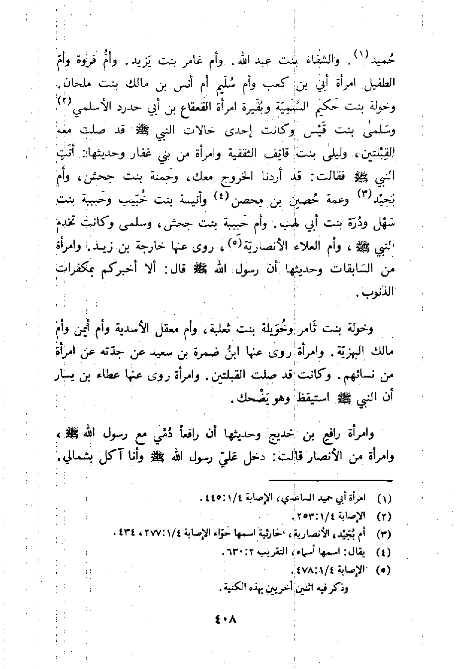 حُمَيْدٍ وَالشِّفَاءُ بِنْتُ عَبْدِ اللَّهِ وَأُمُّ عَامِرٍ بِنْتُ يَزِيدَ وَأُمُّ فَرْوَةَ وَأُمُّ الطُّفَيْلِ امْرَأَةُ أُبَيِّ بْنِ كَعْبٍ وَأُمُّ سُلَيْمٍ أُمُّ أَنَسِ بْنِ مَالِكٍ بِنْتُ مِلْحَانَ وَخَوْلَة بنت حَكِيم السلمِيَّة وبقيرة امْرَأَةُ الْقَعْقَاعِ بْنِ أَبِي حَدْرد الْأَسْلَمِيّ وسلمى بنت قيس وَكَانَت إِحْدَى خالات النَّبِي صلى الله عَلَيْهِ وَسلم قد صلت مَعَه الْقبْلَتَيْنِ وليلى بنت قانف الثقفية وَامْرَأَة من بني غفار وحديثها أَتَتِ النَّبِيَّ صَلَّى اللَّهُ عَلَيْهِ وَسلم فَقَالَت قد أردنَا الْخُرُوج مَعَك وَحمْنَة بنت جحش وَأم بجيد وعمة حُصَيْن بن مُحصن وأنيسة بنت خبيب وحبيبة بنت سهل ودرة بنت أبي لَهب وَأم حَبِيبَة بنت جحش وسلمى وَكَانَت تخْدم النَّبِي صلى الله عَلَيْهِ وَسلم وَأم الْعَلَاء الْأَنْصَارِيَّة روى عَنْهَا خَارِجَة بن زيد وَامْرَأَة من السابقات وحديثها أَن رَسُول الله صلى الله عَلَيْهِ وَسلم قَالَ أَلا أخْبركُم بمكفرات الذُّنُوب وَخَوْلَة بنت ثامر وخويلة بنت ثَعْلَبَة وَأم معقل الأَسدِية وَأم أَيمن وَأم مَالك البهزية وَامْرَأَة روى عَنْهَا بن ضَمرَة بن سعيد عَن جدته عَن امْرَأَة من نِسَائِهِم وَكَانَت قد صلت الْقبْلَتَيْنِ وَامْرَأَة روى عَنْهَا عَطاء بن يسَار أَن النَّبِيَّ صَلَّى اللَّهُ عَلَيْهِ وَسَلَّمَ اسْتَيْقَظَ وَهُوَ يضْحك وَامْرَأَة رَافع بن خديج وحديثها أَن رَافعا دمي مَعَ رَسُولِ اللَّهِ صَلَّى اللَّهُ عَلَيْهِ وَسلم وَامْرَأَة من الْأَنْصَار قَالَت دخل عَليّ رَسُول الله صَلَّى اللَّهُ عَلَيْهِ وَسَلَّمَ وَأَنَا آكل بشمالي