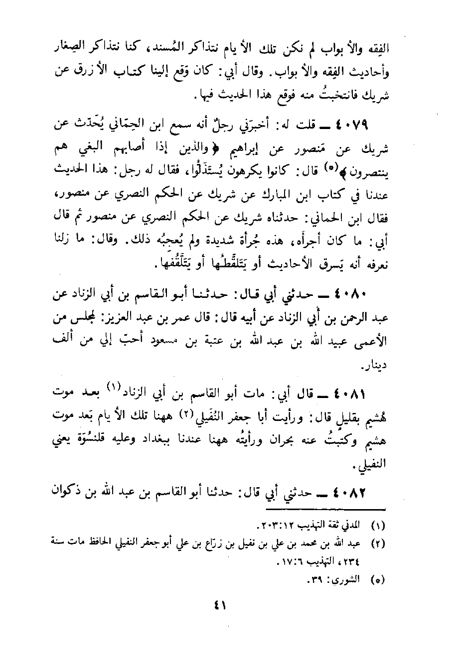 4081 - قَالَ أَبِي مَاتَ أَبُو الْقَاسِمِ بْنُ أَبِي الزِّنَادِ بَعْدَ مَوْتِ هُشَيْمٍ بِقَلِيلٍ قَالَ وَرَأَيْتُ أَبَا جَعْفَرٍ النُّفَيْلِيَّ هَهُنَا تِلْكَ الْأَيَّامَ بَعْدَ مَوْتِ هُشَيْمٍ وَكَتَبْتُ عَنْهُ بِحَرَّانَ وَرَأَيْتُهُ هَهُنَا عِنْدَنَا بِبَغْدَادَ وَعَلَيْهِ قَلَنْسُوَةٌ يَعْنِي النُّفَيْلِيَّ