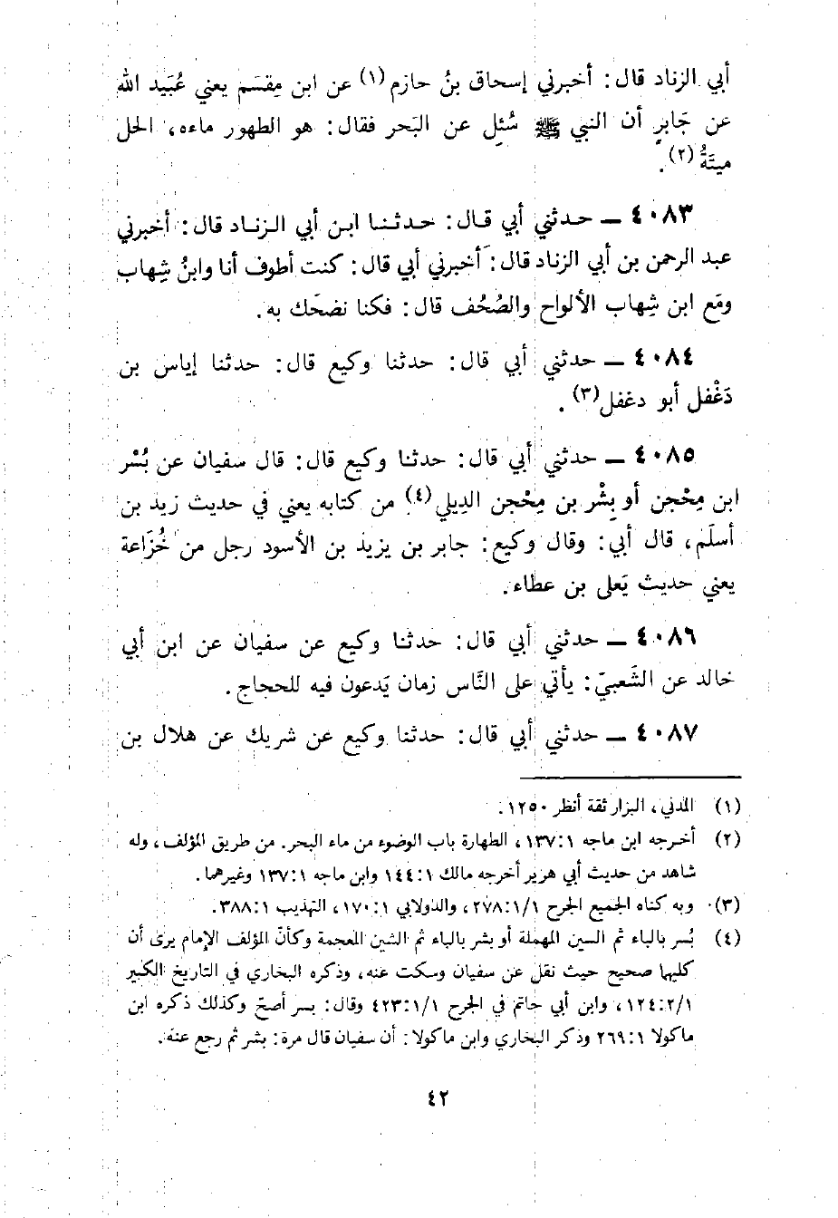 4085 - حَدثنِي أَبِي قَالَ حَدَّثَنَا وَكِيعٌ قَالَ قَالَ سُفْيَان عَن بسر بن محجن أَو بشر بن محجن الديلِي من كِتَابه يَعْنِي فِي حَدِيث زيد بن أسلم قَالَ أبي وَقَالَ وَكِيع جَابر بن يزِيد بن الْأسود رجل من خُزَاعَة يَعْنِي حَدِيث يعلي بن عَطاء