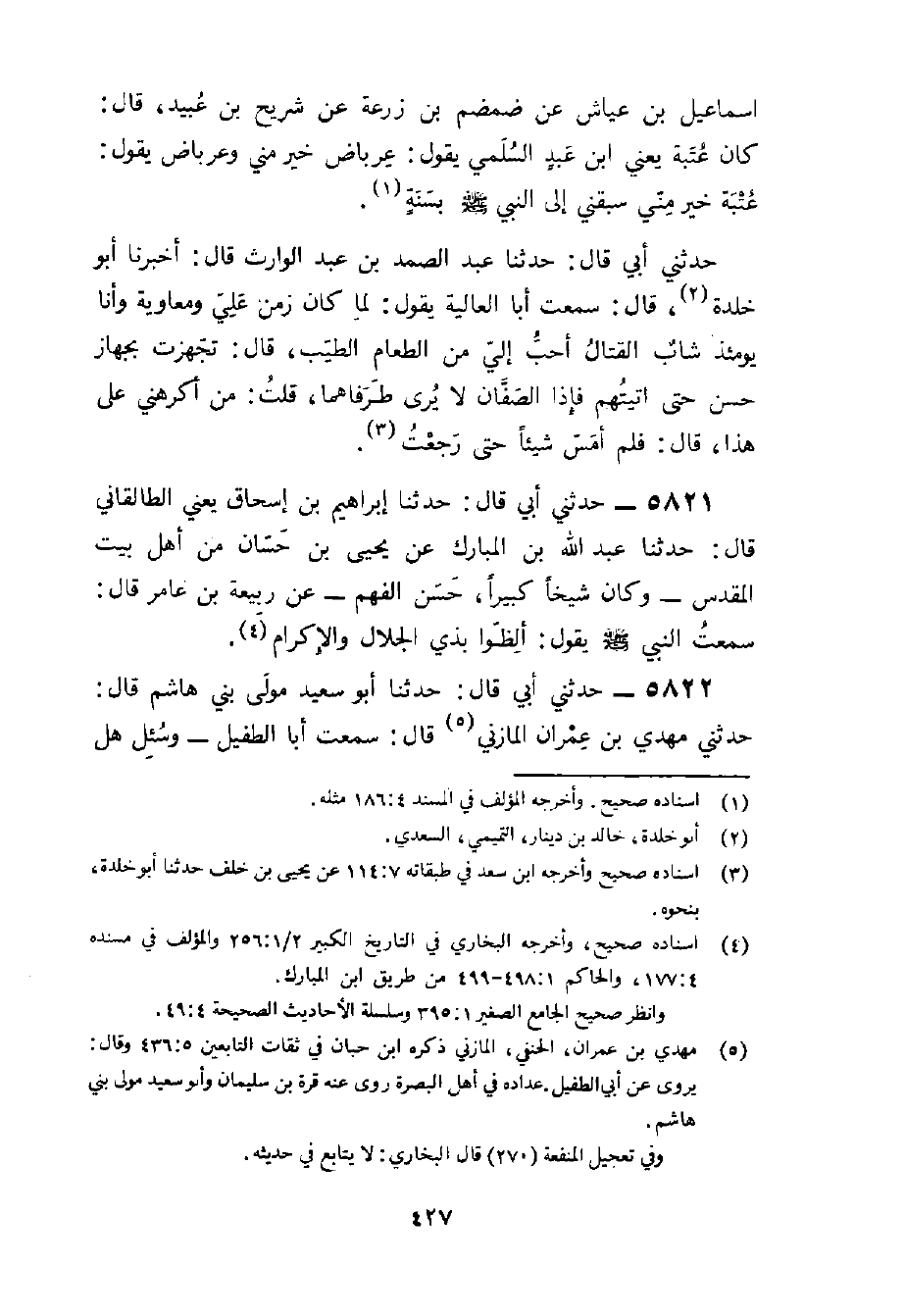 5821 - حَدثنِي أبي قَالَ حَدثنَا إِبْرَاهِيمُ بْنُ إِسْحَاقَ يَعْنِي الطَّالْقَانِيَّ قَالَ حَدثنَا عبد الله بن الْمُبَارك عَن يحيى بن حسان مِنْ أَهْلِ بَيْتِ الْمَقْدِسِ وَكَانَ شَيْخًا كَبِيرًا حَسَنَ الْفَهْمِ عَنْ رَبِيعَةِ بْنِ عَامِرٍ قَالَ سَمِعْتُ النَّبِيَّ صَلَّى اللَّهُ عَلَيْهِ وَسَلَّمَ يَقُولُ أَلِظُّوا بِذِي الْجَلَالِ وَالْإِكْرَامِ