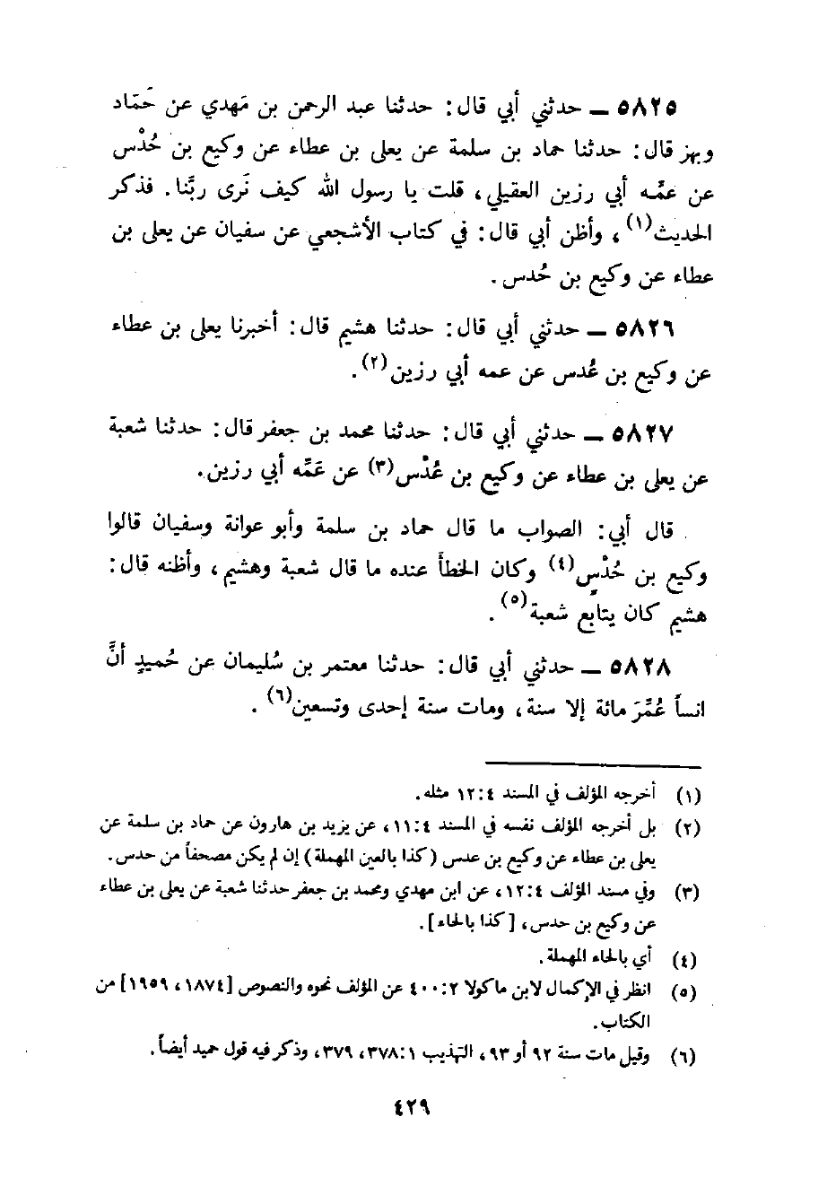 5825 - حَدثنِي أبي قَالَ حَدثنَا عبد الرَّحْمَن بن مهْدي عَن حَمَّادٍ وَبَهْزٍ قَالَ حَدَّثَنَا حَمَّادُ بْنُ سَلَمَةَ عَنْ يَعْلَى بْنِ عَطاء عَن وَكِيع بن حدس عَنْ عَمِّهِ أَبِي رَزِينٍ الْعَقِيلِيِّ قُلْتُ يَا رَسُولَ اللَّهِ كَيْفَ نَرَى رَبَّنَا فَذَكَرَ الْحَدِيثَ وَأَظُنُّ أَبِي قَالَ فِي كِتَابِ الأَشْجَعِيِّ عَنْ سُفْيَانَ عَنْ يَعْلَى بْنِ عَطاء عَن وَكِيع بن حدس