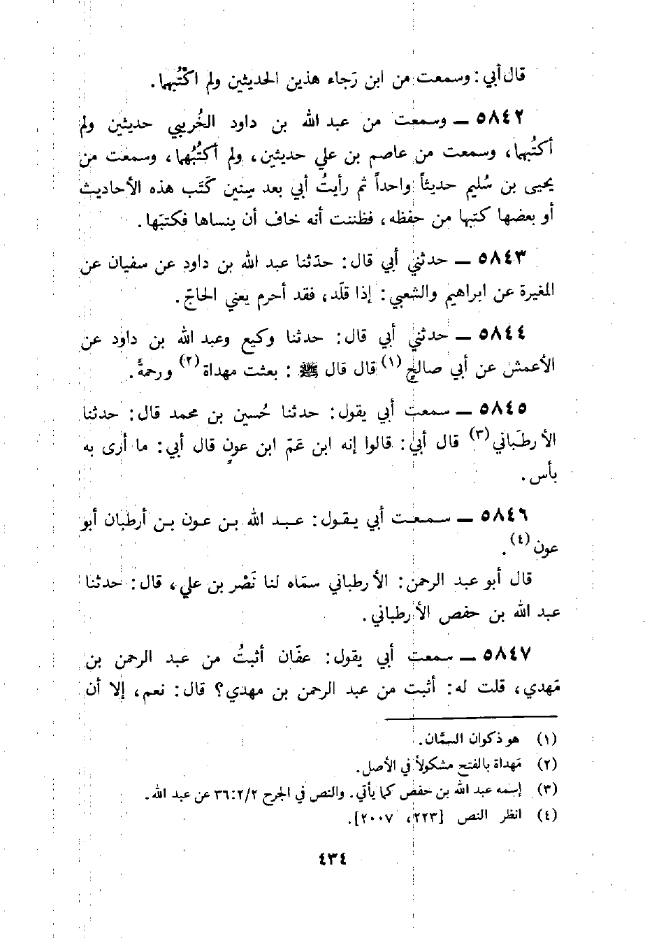 5842 - وَسمعت من عبد الله بن دَاوُد الْخُرَيْبِي حديثين وَلم أكتبهما وَسمعت من عَاصِم بن عَليّ حديثين وَلم أكتبهما وَسمعت من يحيى بن سليم حَدِيثا وَاحِدًا ثمَّ رَأَيْت أبي بعد سِنِين كتب هَذِه الْأَحَادِيث أَو بَعْضهَا كتبهَا من حفظه فَظَنَنْت أَنه خَافَ أَن ينساها فكتبها