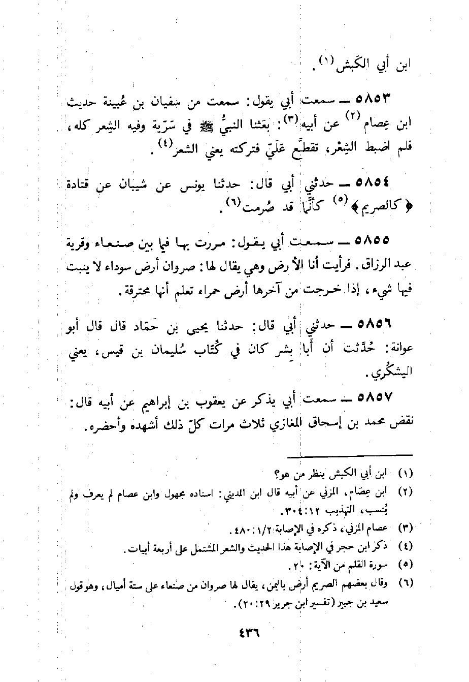 5855 - سَمِعت أبي يَقُول مَرَرْت بهَا فِيمَا بَين صنعاء وقرية عبد الرَّزَّاق فَرَأَيْت أَنا الأَرْض وَهِي يُقَال لَهَا صروان أَرض سَوْدَاء لَا ينْبت فِيهَا شَيْء إِذا خرجت من آخرهَا أَرض حَمْرَاء تعلم أَنَّهَا محترقة
