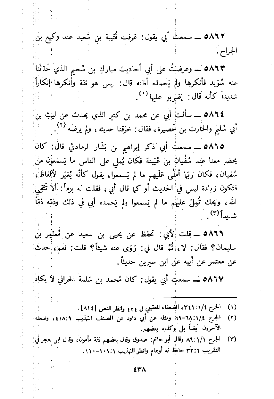 5867 - سَمِعت أبي يَقُول كَانَ مُحَمَّد بن سَلمَة الْحَرَّانِي لَا يكَاد يَقُول فِي شَيْء من حَدِيثه حَدثنَا وَكَذَا كَانَ أَبُو بدر شُجَاع بن الْوَلِيد لَا يَقُول حَدثنَا وَلَا أخبرنَا كَانَ يَقُول ذكره سُلَيْمَان بن مهْرَان وَذكره فلَان قَالَ أبي مَا أقل مَا كَانَ يَقُول حَدثنَا