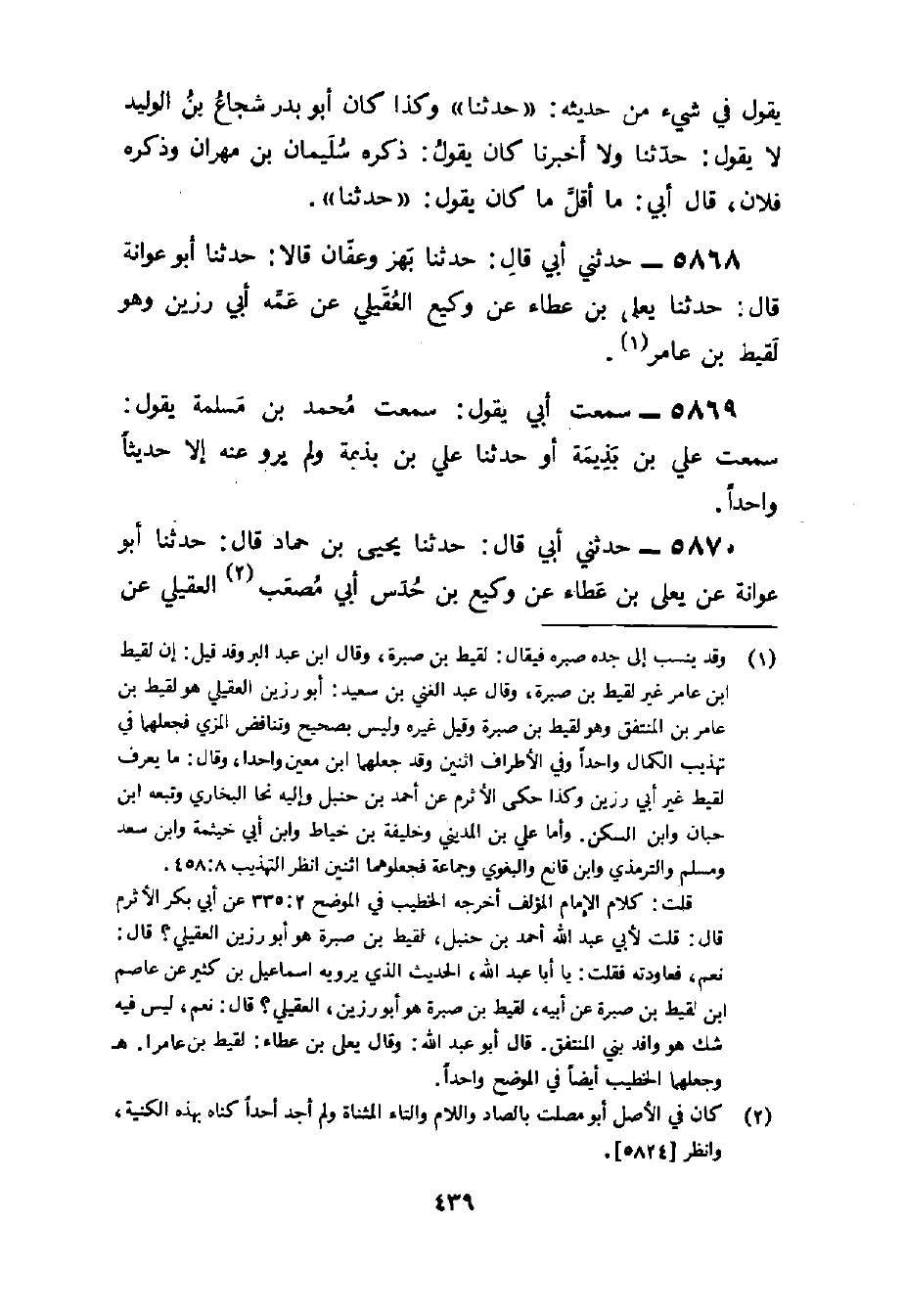 5868 - حَدَّثَنِي أَبِي قَالَ حَدَّثَنَا بهز وَعَفَّان قَالَا حَدثنَا أَبُو عوَانَة قَالَ حَدثنَا يعلى بن عَطاء عَن وَكِيع الْعقيلِيّ عَن عَمِّهِ أَبِي رَزِينٍ وَهُوَ لَقِيطُ بن عَامر