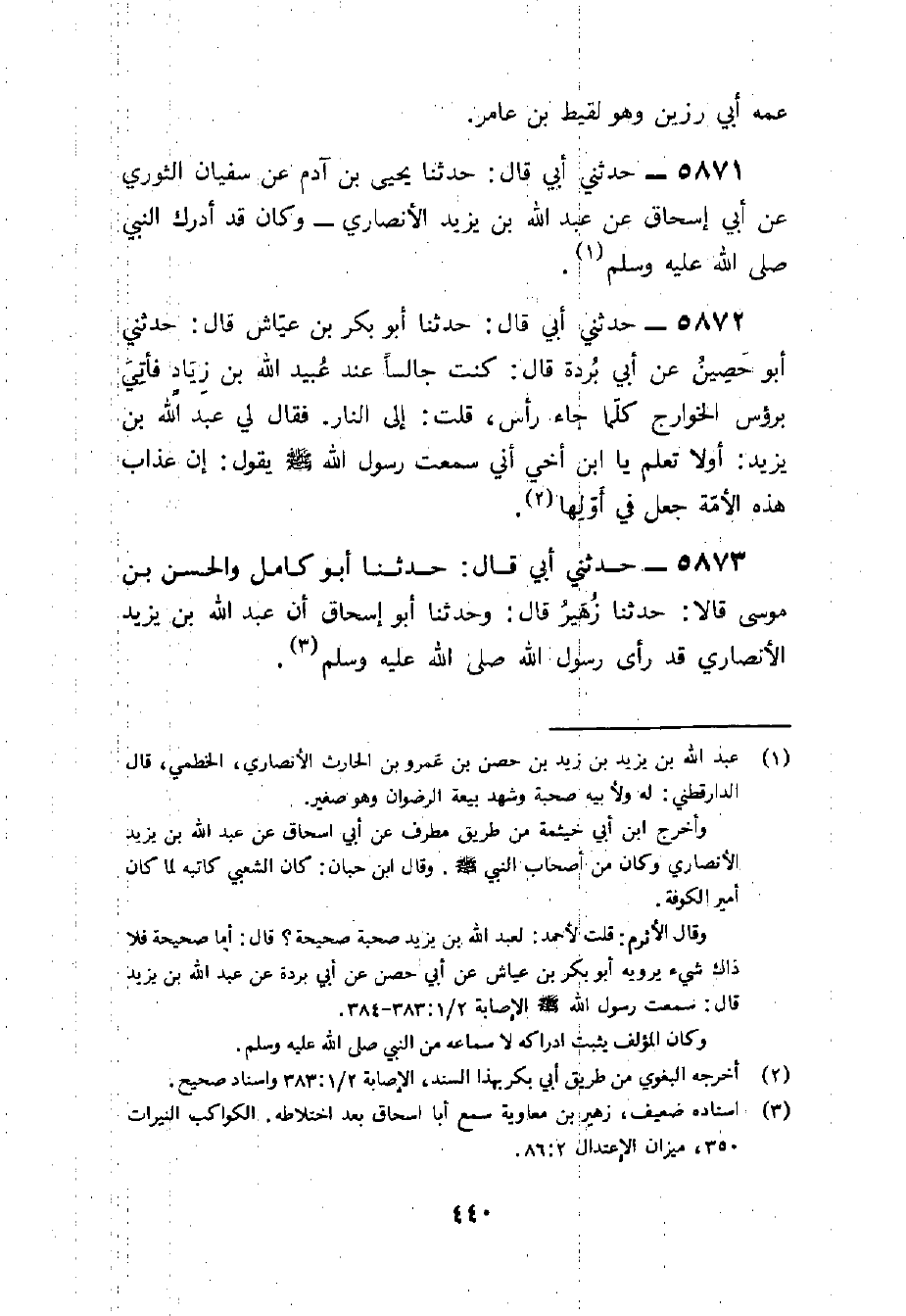5871 - حَدثنِي أبي قَالَ حَدثنَا يحيى بن آدم عَن سُفْيَان الثَّوْريّ عَن أبي إِسْحَاق عَن عبد الله بن يزِيد الْأنْصَارِيّ وَكَانَ قد أدْرك النَّبِي صلى اللَّهُ عَلَيْهِ وَسَلَّمَ