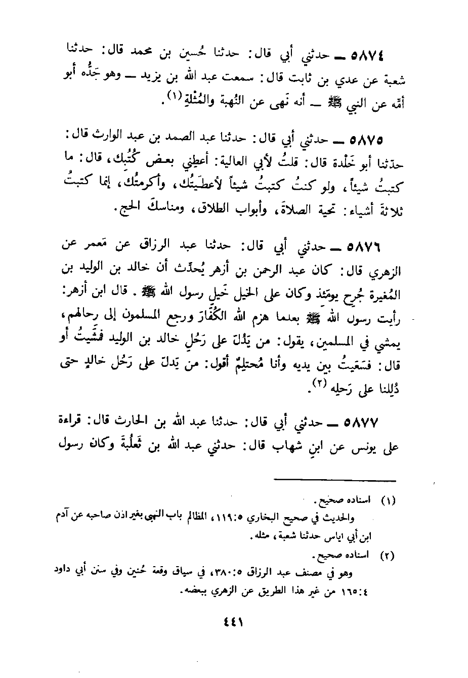 5876 - حَدثنِي أبي قَالَ حَدثنَا عَبْدُ الرَّزَّاقِ عَنْ مَعْمَرٍ عَنِ الزُّهْرِيِّ قَالَ كَانَ عَبْدُ الرَّحْمَنِ بْنُ أَزْهَرَ يُحَدِّثُ أَنَّ خَالِدَ بْنَ الْوَلِيدِ بْنِ الْمُغِيرَةِ جُرِحَ يَوْمَئِذٍ وَكَانَ عَلَى الْخَيْلِ خَيْلِ رَسُولَ اللَّهِ صَلَّى اللَّهُ عَلَيْهِ وَسلم قَالَ بن أَزْهَرَ رَأَيْتُ رَسُولَ اللَّهِ صَلَّى الله عَلَيْهِ وَسلم بَعْدَمَا هَزَمَ اللَّهُ الْكُفَّارَ وَرَجَعَ الْمُسْلِمُونَ إِلَى رِحَالِهِمْ يَمْشِي فِي الْمُسْلِمِينَ يَقُولُ مَنْ يَدُلُّ عَلَى رَحْلِ خَالِدِ بْنِ الْوَلِيدِ فَمَشَيْتُ أَوْ قَالَ فَسَعَيْتُ بَيْنَ يَدَيْهِ وَأَنَا مُحْتَلِمٌ أَقُولُ مَنْ يَدُلُّ عَلَى رَحل خَالِد حَتَّى دللنا عَلَى رَحْلِهِ