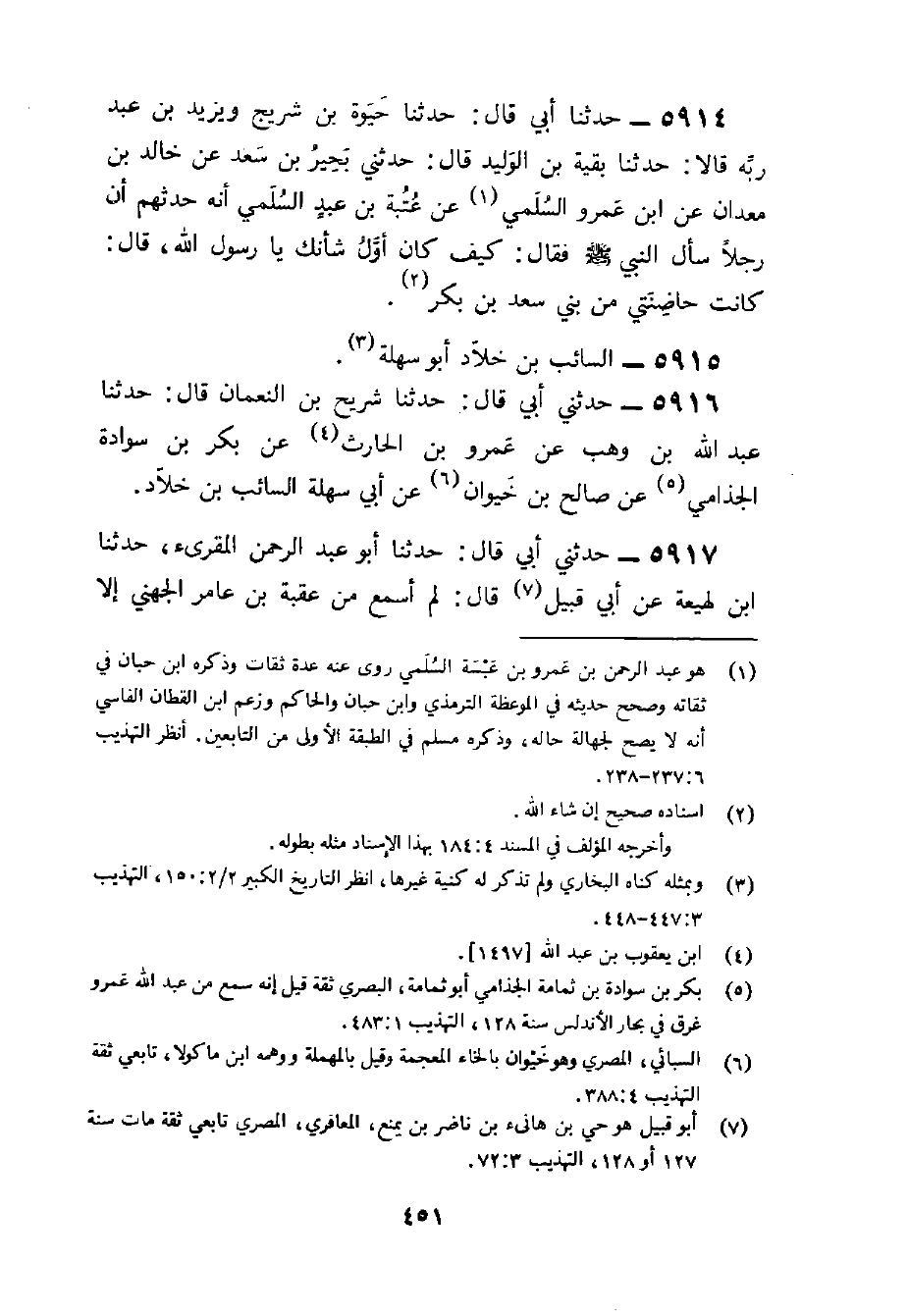 5916 - حَدثنِي أبي قَالَ حَدثنَا شُرَيْح بن النُّعْمَان قَالَ حَدثنَا عبد الله بن وهب عَن عَمْرو بن الْحَارِث عَن بكر بن سوَادَة الجذامي عَن صَالح بن خيوان عَن أبي سهلة السَّائِب بن خَلاد