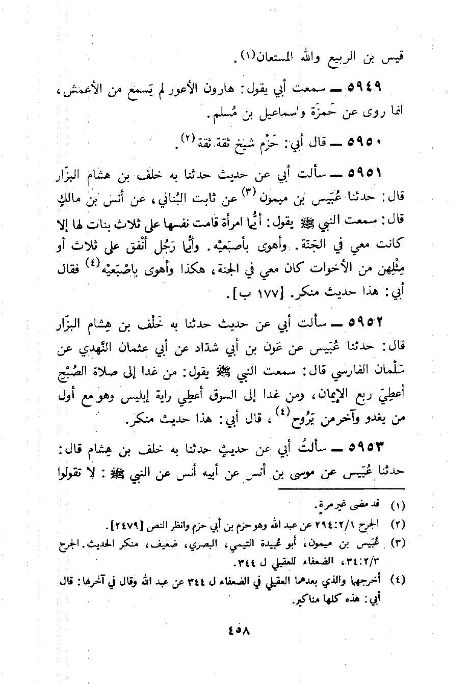 5951 - سَأَلت أبي عَن حَدِيث حَدَّثَنَا بِهِ خَلَفُ بْنُ هِشَامٍ الْبَزَّارُ قَالَ حَدَّثَنَا عُبَيْسِ بْنُ مَيْمُونٍ عَنْ ثَابِتٍ الْبُنَانِيِّ عَنْ أَنَسِ بْنِ مَالِكٍ قَالَ سَمِعْتُ النَّبِيَّ صَلَّى اللَّهُ عَلَيْهِ وَسَلَّمَ يَقُولُ أَيُّمَا امْرَأَةٍ قَامَتْ نَفْسُهَا عَلَى ثَلَاثِ بَنَاتٍ لَهَا إِلَّا كَانَتْ مَعِي فِي الْجَنَّةِ وَأَهْوَى بِأُصْبُعَيْهِ وَأَيُّمَا رَجُلٍ أَنْفَقَ عَلَى ثَلَاث أَوْ مِثْلِهِنَّ مِنَ الْأَخَوَاتِ كَانَ مَعِي فِي الْجَنَّةِ هَكَذَا وَأَهْوَى بإصبعيه فَقَالَ أَبِي هَذَا حَدِيثٌ مُنْكَرٌ