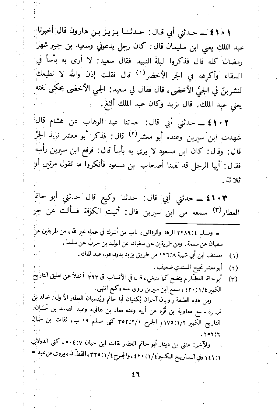 4103 - حَدثنِي أبي قَالَ حَدثنَا وَكِيع قَالَ حَدثنِي أَبُو حَاتِم الْعَطَّار سَمعه من بن سِيرِين قَالَ أتيت الْكُوفَة فَسَأَلت عَن جر عبد الله فَلم أجد لَهُ أصلا