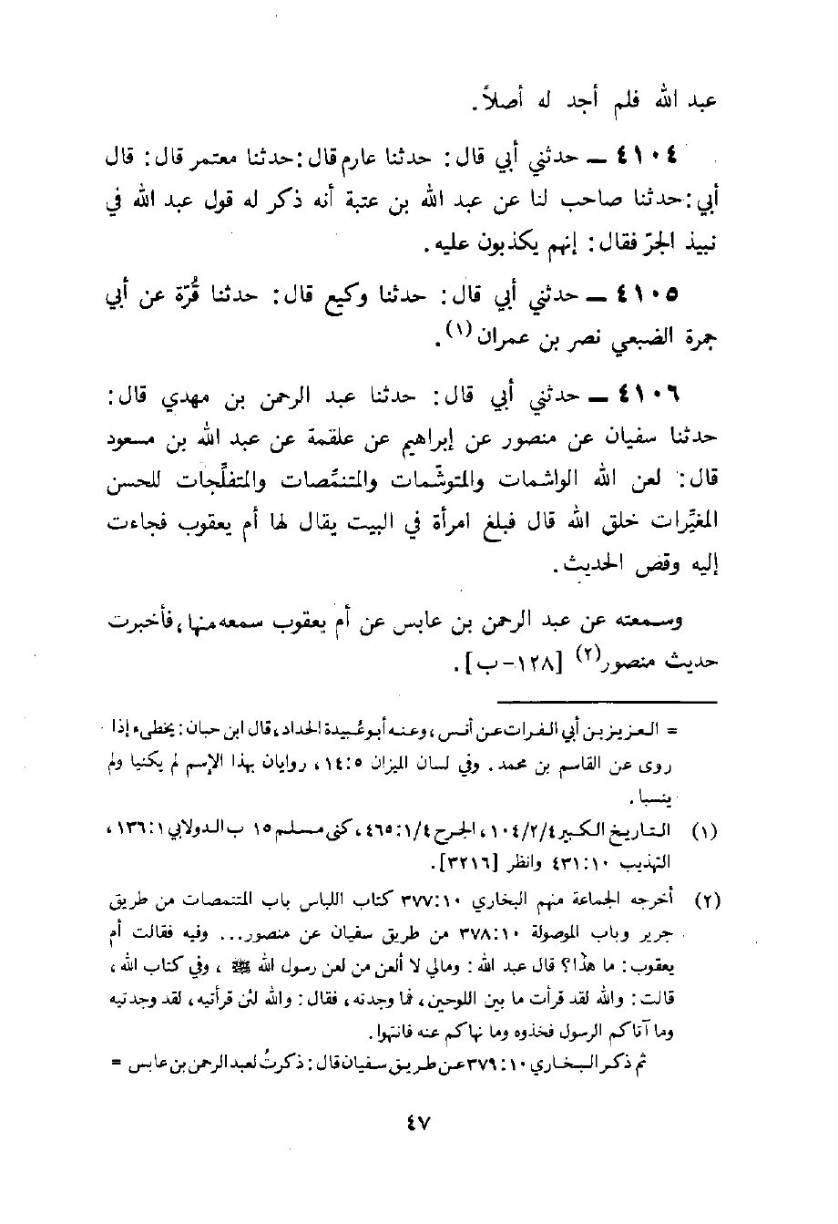 4106 - حَدثنِي أبي قَالَ حَدثنَا عبد الرَّحْمَن بن مهْدي قَالَ حَدثنَا سُفْيَان عَن مَنْصُور عَن إِبْرَاهِيم عَن عَلْقَمَة عَن عبد الله بْنِ مَسْعُودٍ قَالَ لَعَنَ اللَّهُ الْوَاشِمَاتِ وَالْمُتَوَشِّمَاتِ وَالْمُتَنَمِّصَاتِ وَالْمُتَفَلِّجَاتِ لِلْحُسْنِ الْمُغَيِّرَاتِ خَلْقَ اللَّهِ قَالَ فَبَلَغَ امْرَأَةً فِي الْبَيْتِ يُقَالُ لَهَا أَمُّ يَعْقُوبَ فَجَاءَتْ إِلَيْهِ وَقَصَّ الحَدِيث وسمعته عَن عبد الرَّحْمَن بن عَابس عَنْ أُمِّ يَعْقُوبَ سَمِعَهُ مِنْهَا فَأخْبرت حَدِيث مَنْصُور