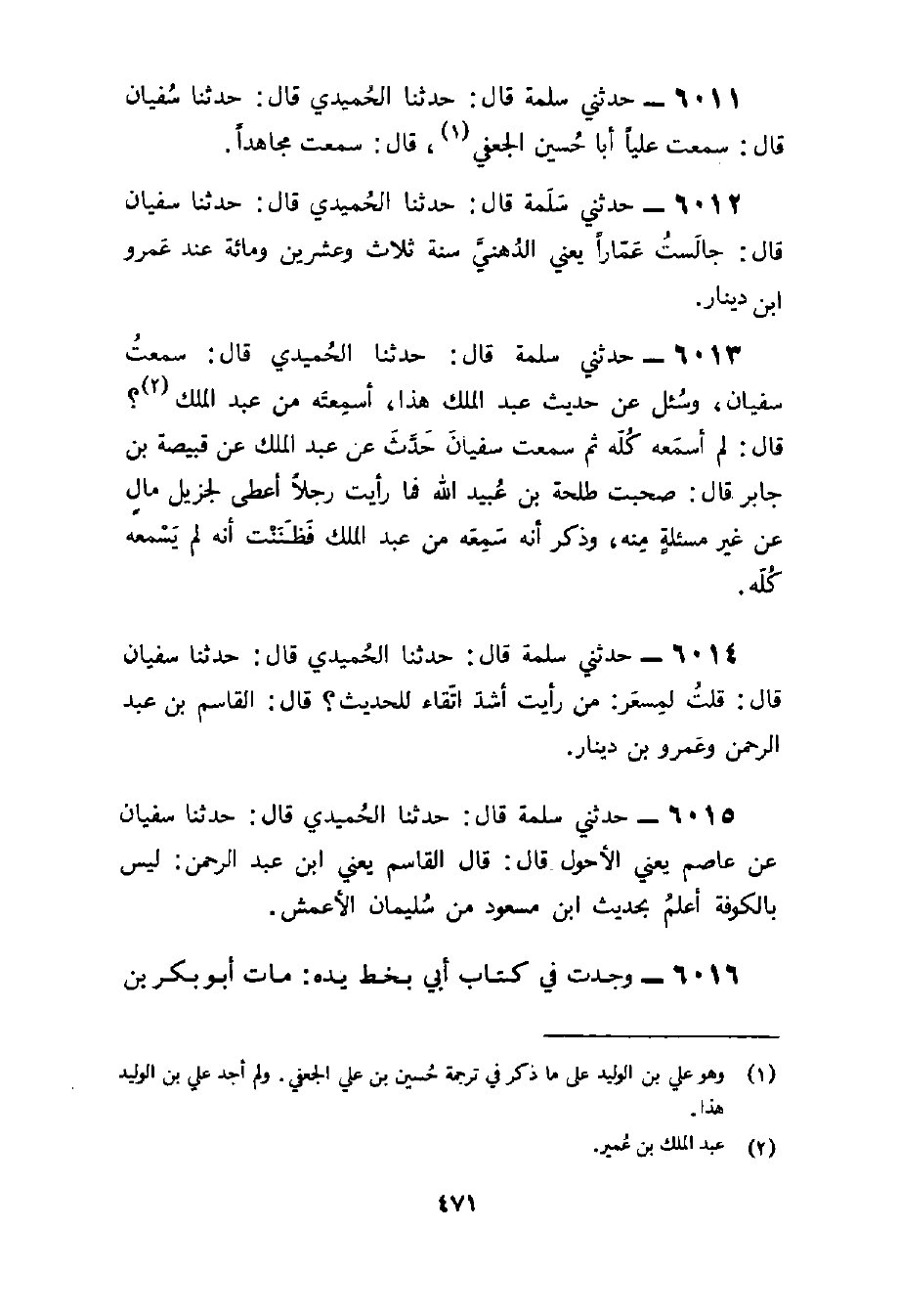 6014 - حَدثنِي سَلمَة قَالَ حَدثنَا الْحميدِي قَالَ حَدثنَا سُفْيَان قَالَ قلت لمسعر من رَأَيْت أَشد اتقاء للْحَدِيث قَالَ الْقَاسِم بن عبد الرَّحْمَن وَعَمْرو بن دِينَار