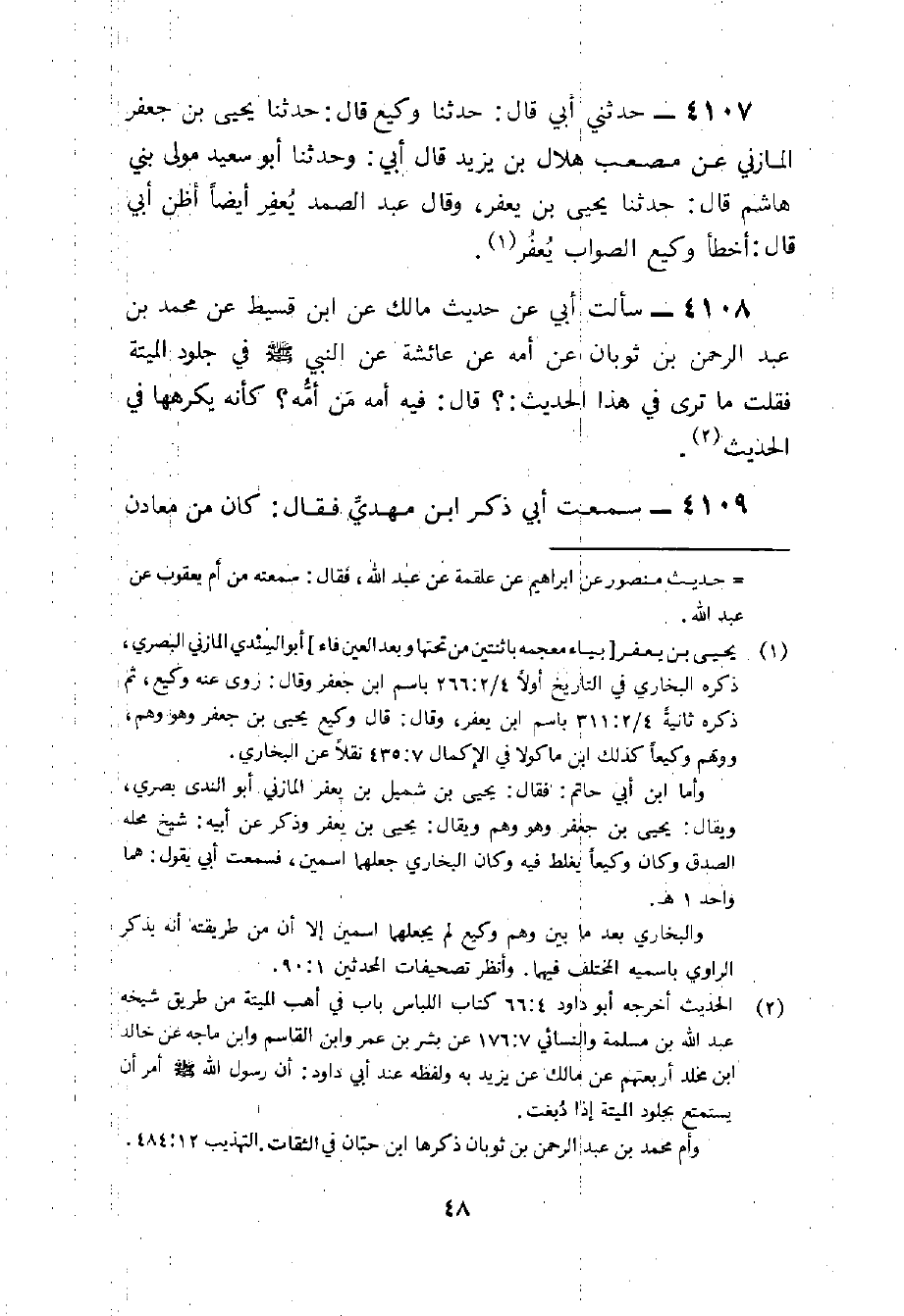 4108 - سَأَلْتُ أَبِي عَنْ حَدِيثِ مَالِكٍ عَنِ بْنِ قُسَيْطٍ عَنْ مُحَمَّدِ بْنِ عَبْدِ الرَّحْمَنِ بْنِ ثَوْبَانَ عَنْ أُمِّهِ عَنْ عَائِشَةَ عَنِ النَّبِيِّ صَلَّى اللَّهُ عَلَيْهِ وَسَلَّمَ فِي جُلُودِ الْمَيْتَةِ فَقُلْتُ مَا تَرَى فِي هَذَا الحَدِيث فَقَالَ فِيهِ أُمُّهُ مِنْ أُمِّهِ كَأَنَّهُ يكرهها فِي الْحَدِيثِ