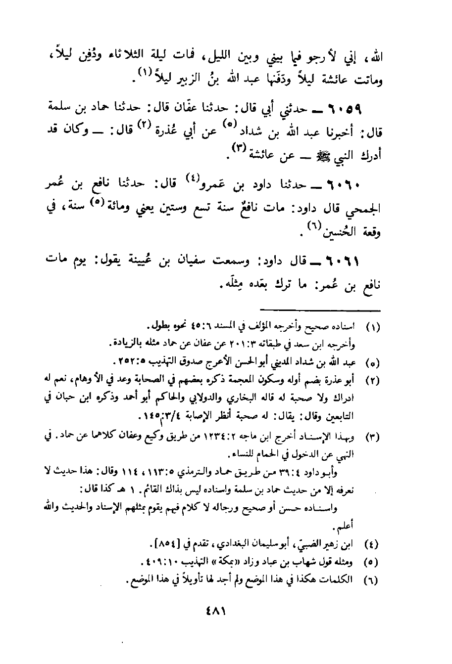 6060 - حَدثنَا دَاوُد بن عَمْرو قَالَ حَدثنَا نَافِع بن عمر الجُمَحِي قَالَ دَاوُد مَاتَ نَافِع سنة تسع وَسِتِّينَ يَعْنِي وَمِائَة سنة فِي وقْعَة الْحُسَيْن