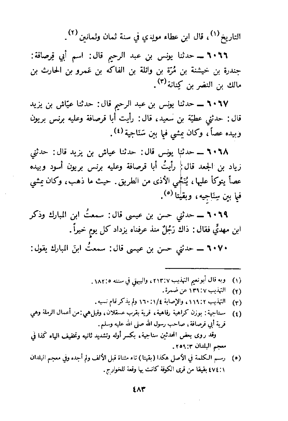 6067 - حَدثنَا يُونُس بن عبد الرَّحِيم قَالَ حَدثنَا عَيَّاش بن يزِيد قَالَ حَدثنِي عَطِيَّة بن سعيد قَالَ رَأَيْت أَبَا قرصافة وَعَلِيهِ برنس بريون وَبِيَدِهِ عَصا وَكَانَ يمشي فِيمَا بَين سناجية