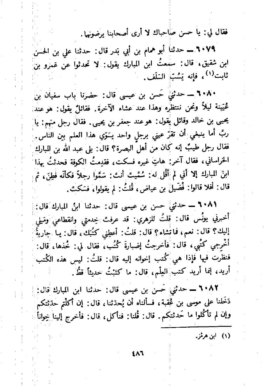 6080 - حَدثنِي حسن بن عِيسَى قَالَ حَضَرنَا بَاب سُفْيَان بن عُيَيْنَة لَيْلًا وَنحن ننتظره وَهَذَا عِنْد عشَاء الْآخِرَة فَقَائِل يَقُول هُوَ عِنْد يحيى بن خَالِد وَقَائِل يَقُول هُوَ عِنْد جَعْفَر بن يحيى فَقَالَ رجل مِنْهُم يَا رب أما يَنْبَغِي أَن تقر عَيْني بِرَجُل وَاحِد يسوى هَذَا الْعلم بَين النَّاس فَقَالَ رجل طيب أَنه كَانَ من أهل الْبَصْرَة قَالَ بلَى عبد الله بن الْمُبَارك الْخُرَاسَانِي فَقَالَ آخر هَات غَيره فَسكت فَقدمت الْكُوفَة فَحدثت بِهَذَا بن الْمُبَارك إِلَّا أَنِّي لم أقل لَهُ سميت أَنْت سموا رجلا فَكَأَنَّهُ فطن ثمَّ قَالَ أَفلا قَالُوا فُضَيْل بن عِيَاض قلت لم يَقُولُوا فَسكت