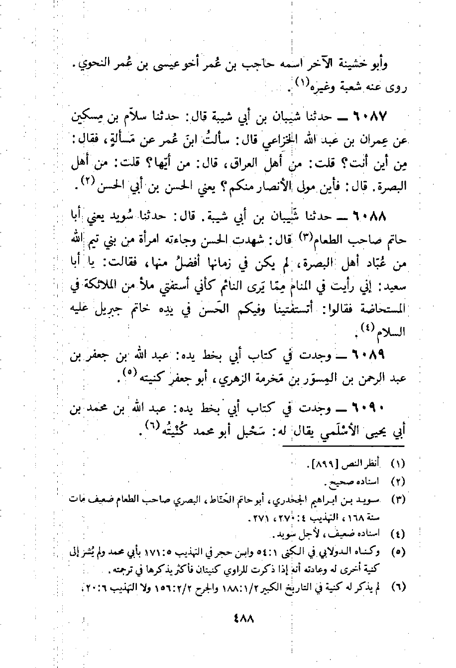 6088 - حَدثنَا شَيبَان بن أبي شيبَة قَالَ حَدثنَا سُوَيْد يَعْنِي أَبَا حَاتِم صَاحب الطَّعَام قَالَ شهِدت الْحسن وجاءته امْرَأَة من بني تيم الله من عباد أهل الْبَصْرَة لم يكن فِي زمانها أفضل مِنْهَا فَقَالَت يَا أَبَا سعيد إِنِّي رَأَيْت فِي الْمَنَام مِمَّا يرى النَّائِم كَأَنِّي أستفتي مَلأ من الْمَلَائِكَة فِي الْمُسْتَحَاضَة فَقَالُوا أتستفتينا وَفِيكُمْ الْحسن فِي يَده خَاتم جِبْرِيل عَلَيْهِ السَّلَام