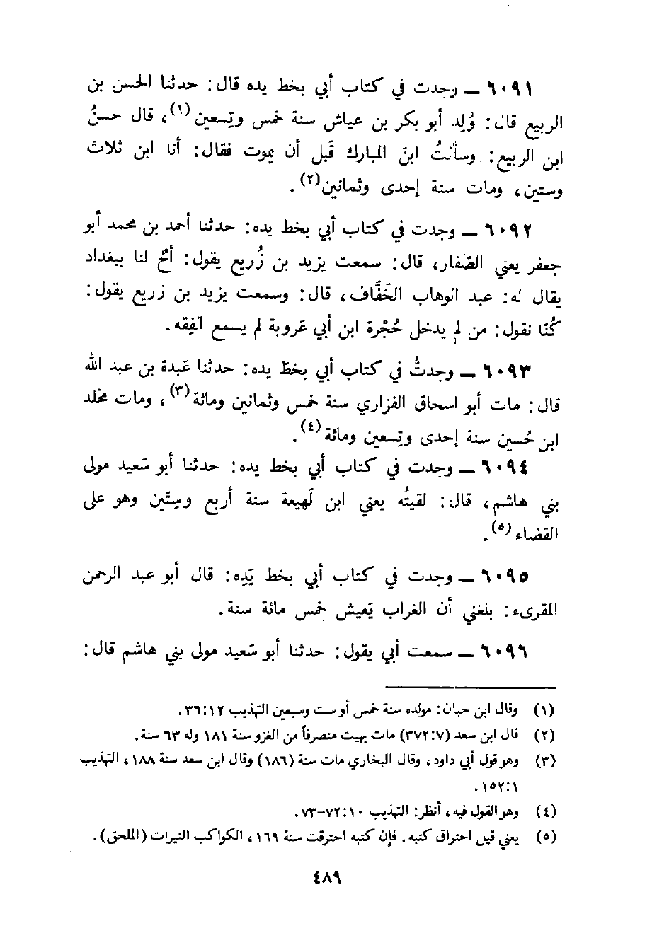 6091 - وجدت فِي كتاب أبي بِخَط يَده قَالَ حَدثنَا الْحسن بن الرّبيع قَالَ ولد أَبُو بكر بن عَيَّاش سنة خمس وَتِسْعين قَالَ حسن بن الرّبيع وَسَأَلت بن الْمُبَارك قبل أَن يَمُوت فَقَالَ أَنا بن ثَلَاث وَسِتِّينَ وَمَات سنة إِحْدَى وَثَمَانِينَ