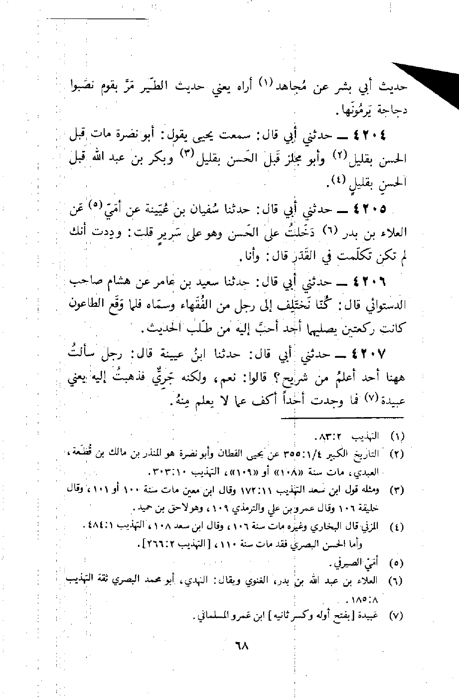 4205 - حَدثنِي أبي قَالَ حَدثنَا سُفْيَان بن عُيَيْنَة عَن أُمِّي عَن الْعَلَاء بن بدر دخلت على الْحسن وَهُوَ على سَرِير قلت وددت أَنَّك لم تكن تَكَلَّمت فِي الْقدر قَالَ وَأَنا