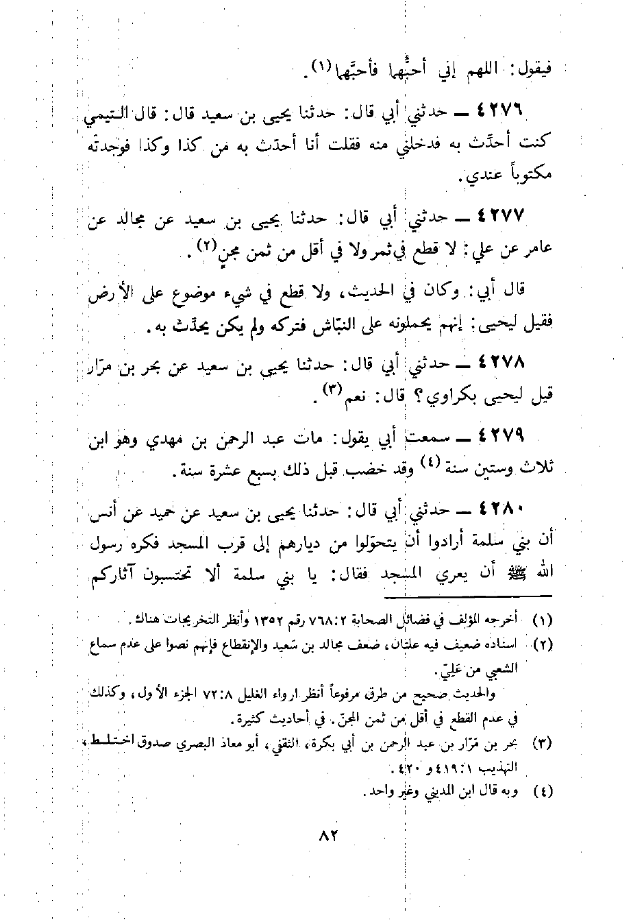 4280 - حَدَّثَنِي أَبِي قَالَ حَدثنَا يحيى بن سعيد عَنْ حُمَيْدٍ عَنْ أَنَسٍ أَنَّ بَنِي سَلَمَةَ أَرَادُوا أَنْ يَتَحَوَّلُوا مِنْ دِيَارِهِمْ إِلَى قُرْبِ الْمَسْجِدِ فَكَرِهَ رَسُولُ اللَّهِ صَلَّى اللَّهُ عَلَيْهِ وَسَلَّمَ أَنْ يُعْرَى الْمَسْجِدُ فَقَالَ يَا بَنِي سَلَمَةَ أَلَا تحتسبون آثَاركُم فأقاموا