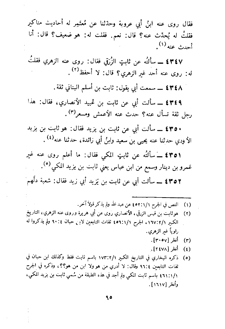 4347 - سَأَلته عَن ثَابت الزرقي فَقَالَ روى عَنهُ الزُّهْرِيّ فَقلت لَهُ روى عَنهُ أحد غير الزُّهْرِيّ قَالَ لَا أحفظ