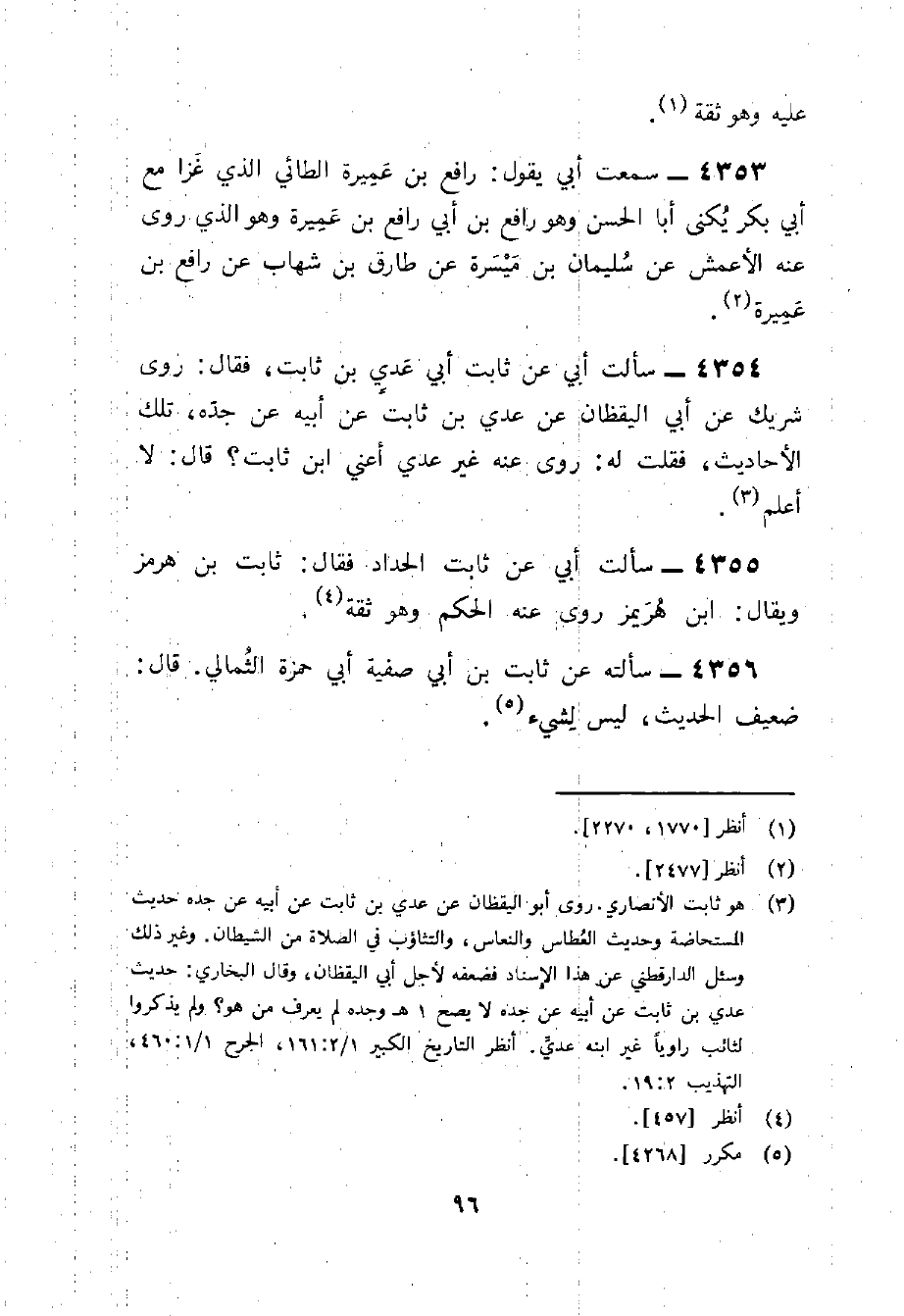 4354 - سَأَلت أبي عَن ثَابت أبي عدي بن ثَابت فَقَالَ روى شريك عَن أبي الْيَقظَان عَن عدي بن ثَابت عَن أَبِيه عَن جده تِلْكَ الْأَحَادِيث فَقلت لَهُ روى عَنهُ غير عدي أَعنِي بن ثَابت قَالَ لَا أعلم