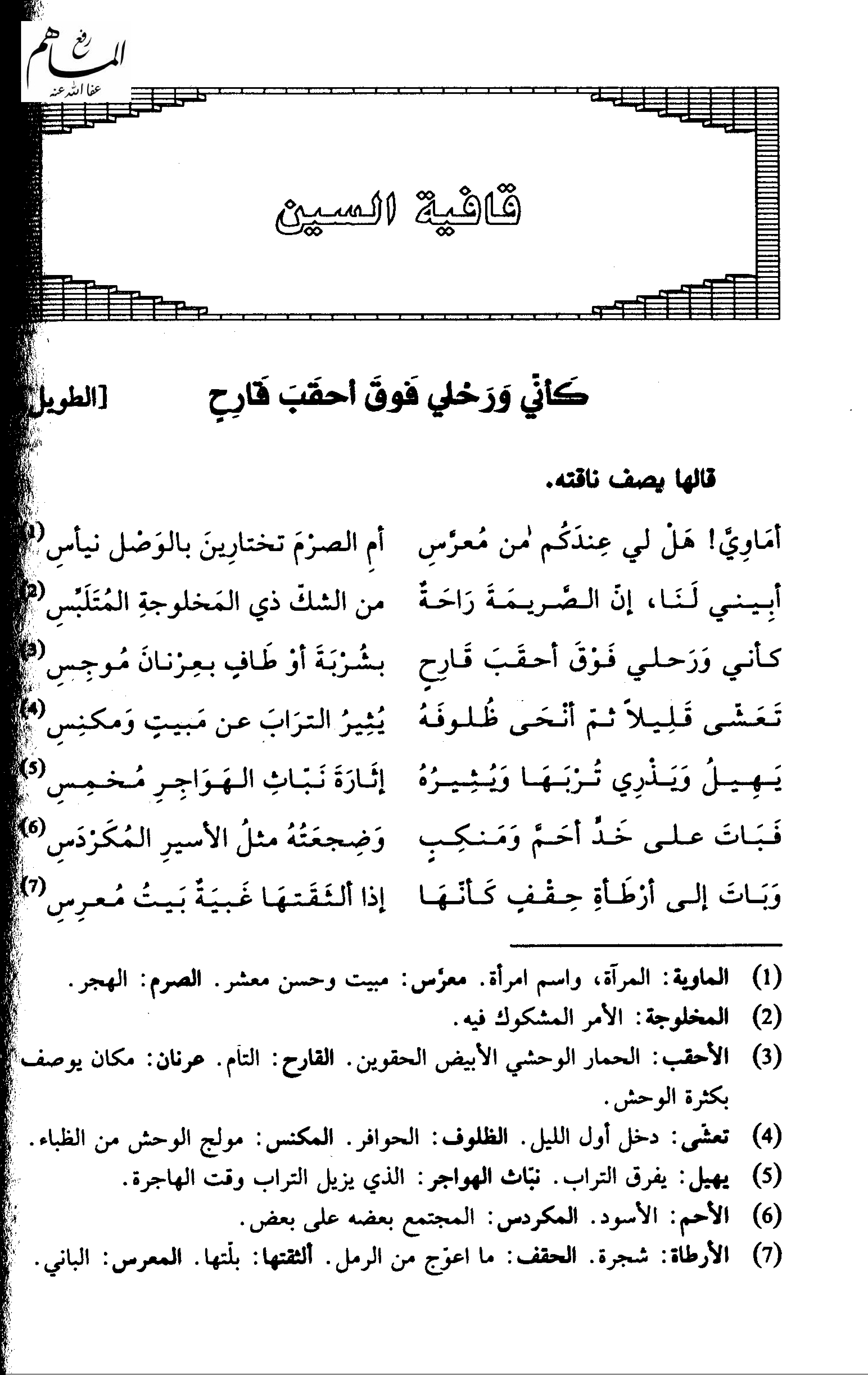(¬3) الأحقب: الحمار الوحشي الأبيض الحقوين. القارح: التام. عرنان: مكان يوصف بكثرة الوحش.