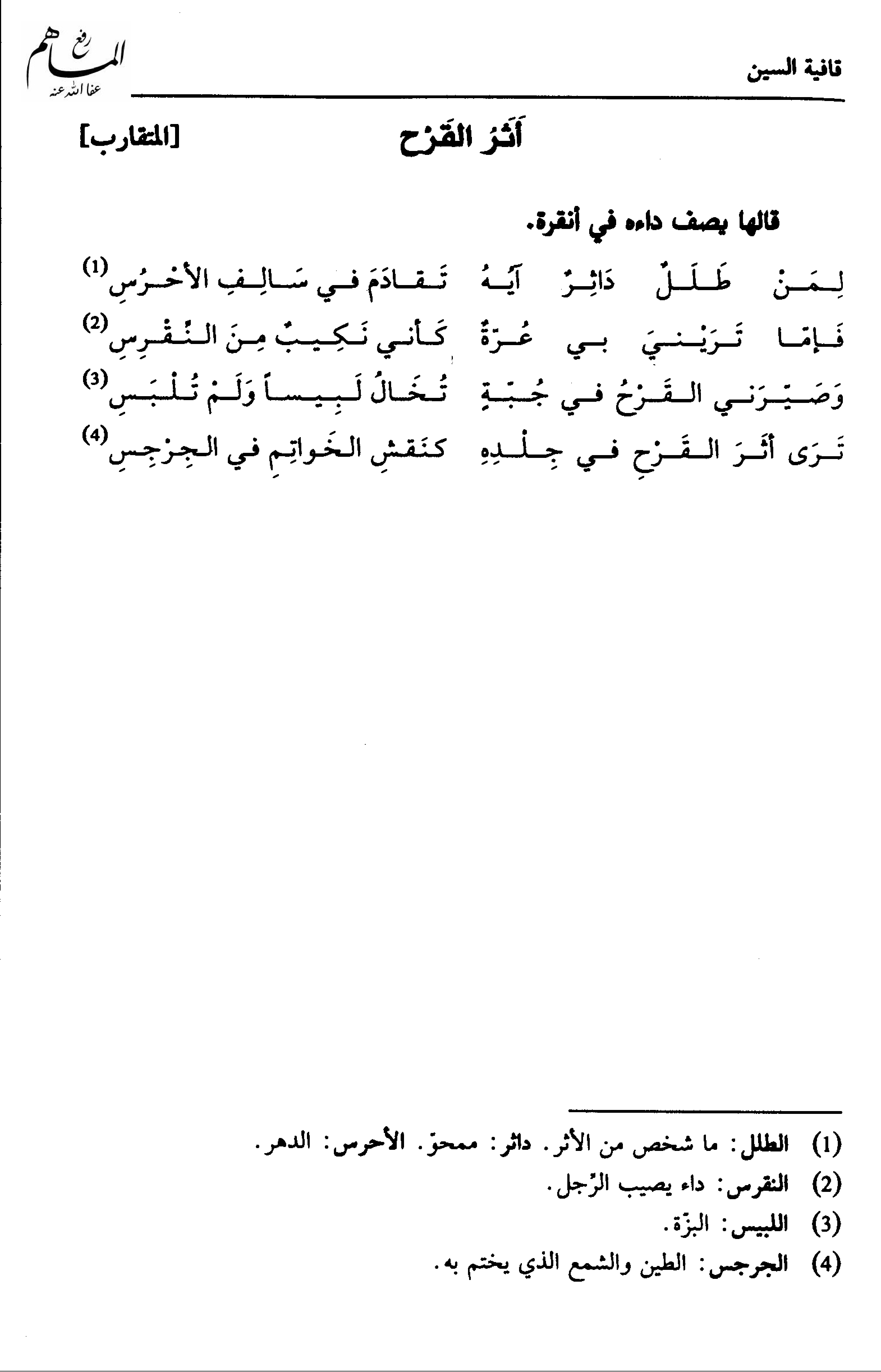 (¬1) الطلل: ما شخص من الأثر. داثر: ممحوّ. الأحرس: الدهر.
