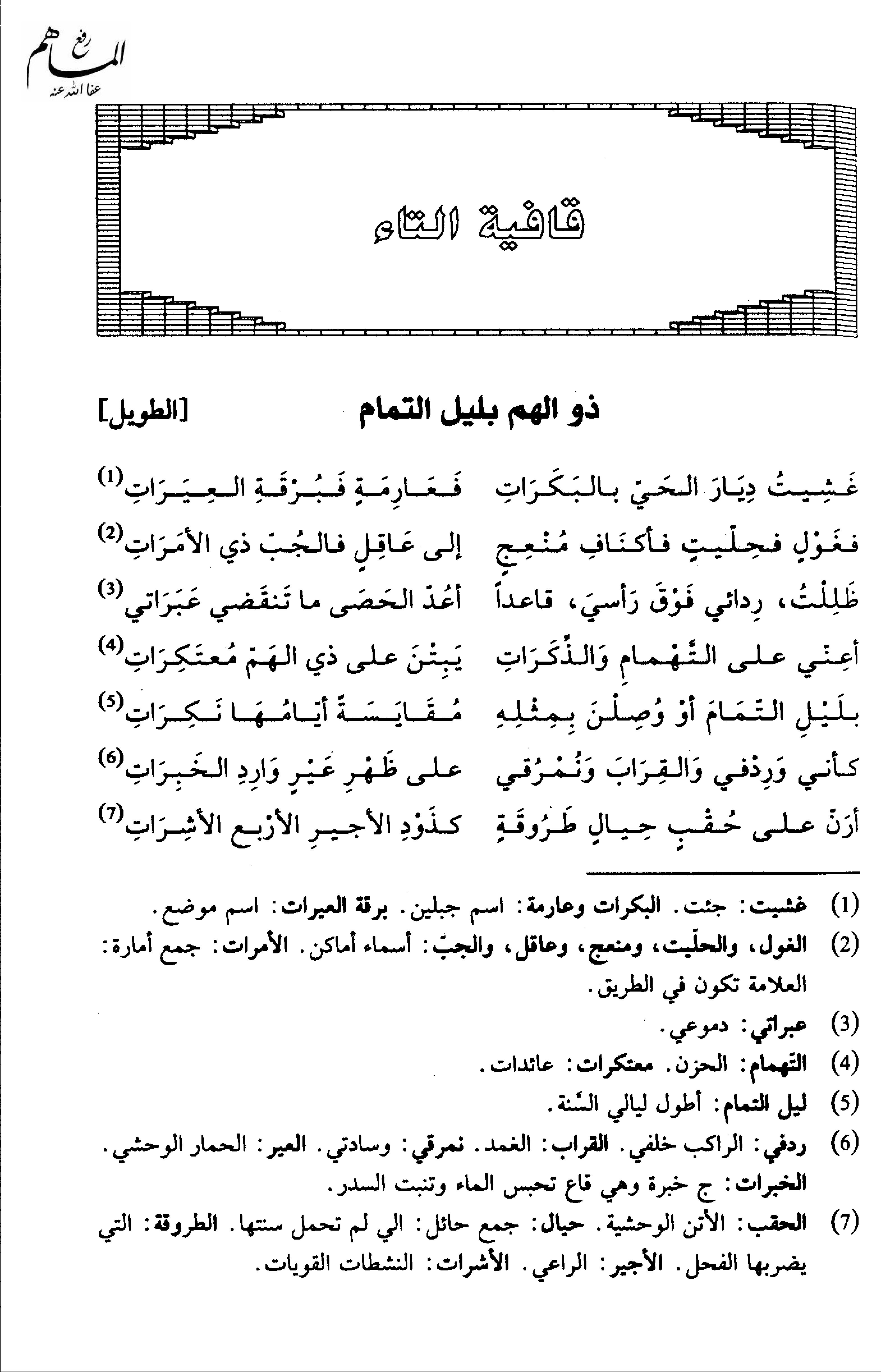 (¬6) ردفي: الراكب الخلفي. القراب: الغمد. نمرقي: وسادتي. العير: الحمار الوحشي. الخبرات: ج خبرة وهي قاع تحبس الماء وتنبت السدر.