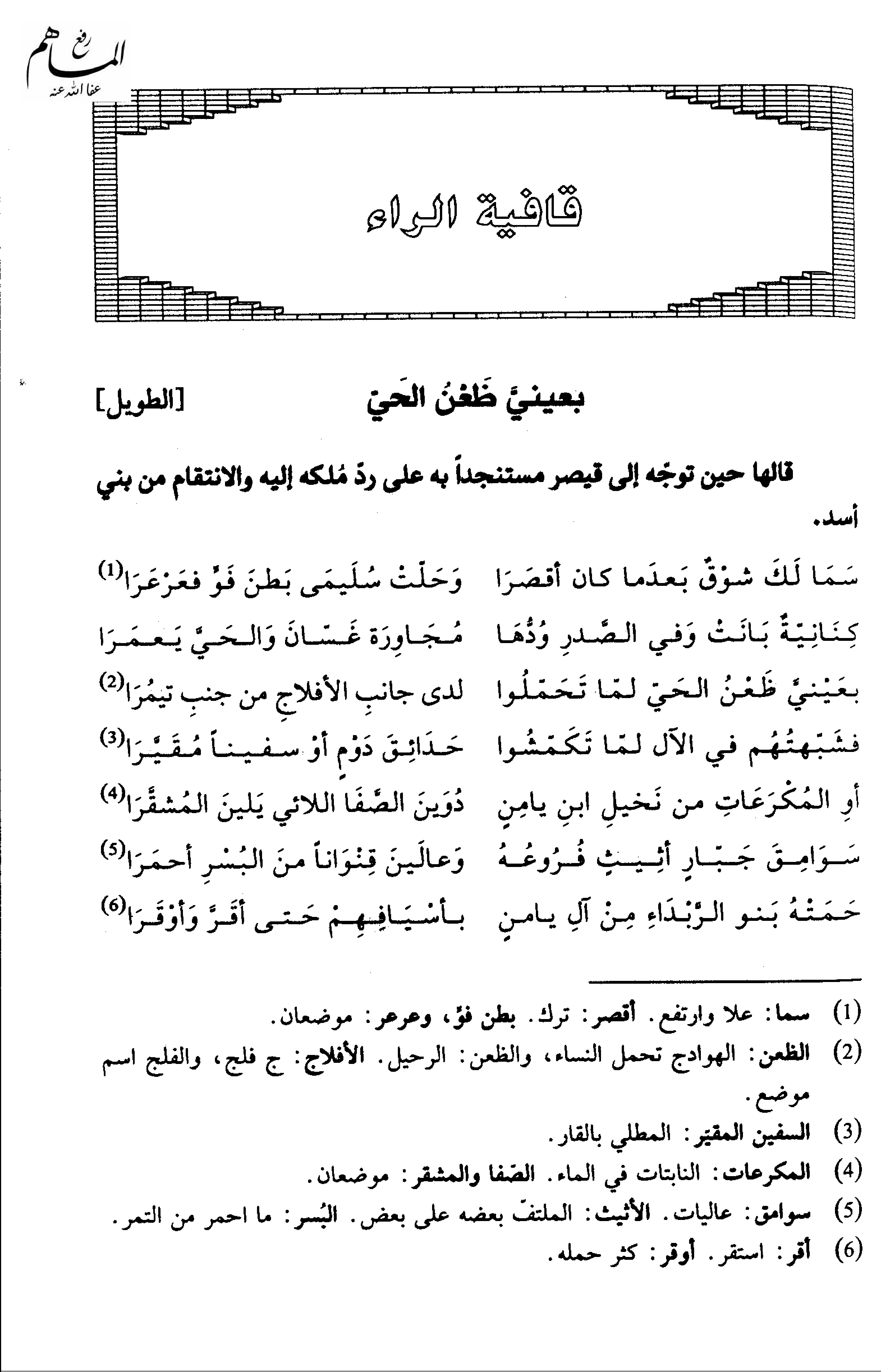 سَمَا لَكَ شوْقٌ بَعدَما كان أقصَرَا ... وَحَلّتْ سُلَيمَى بَطنَ فَوِّ فعَرْعَرَا (¬1)