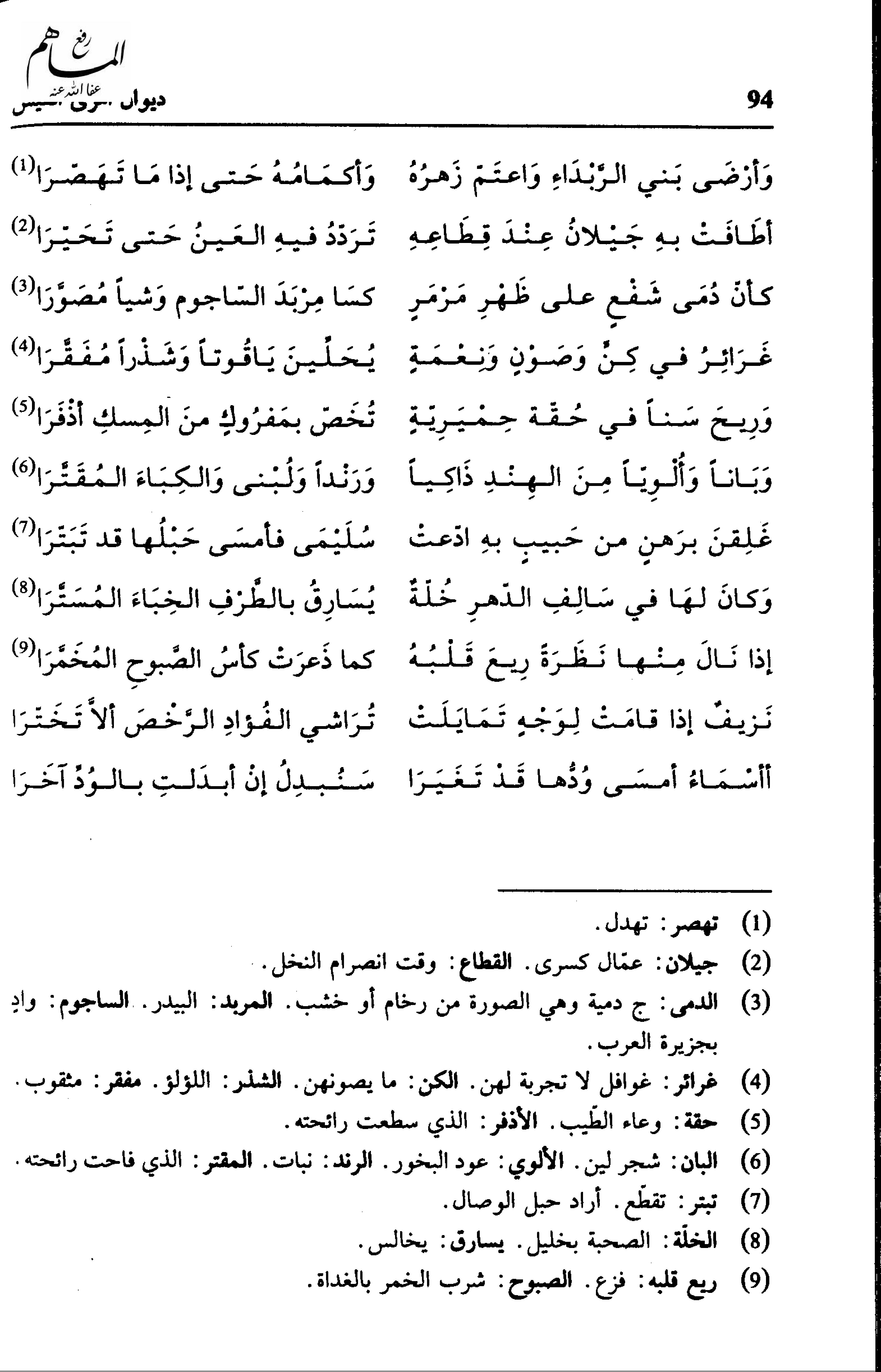 (¬3) الدمى: ج دمية وهي الصورة من رخام أو خشب. المربد: البيدر. الساجوم: وادٍ بجزيرة العرب.