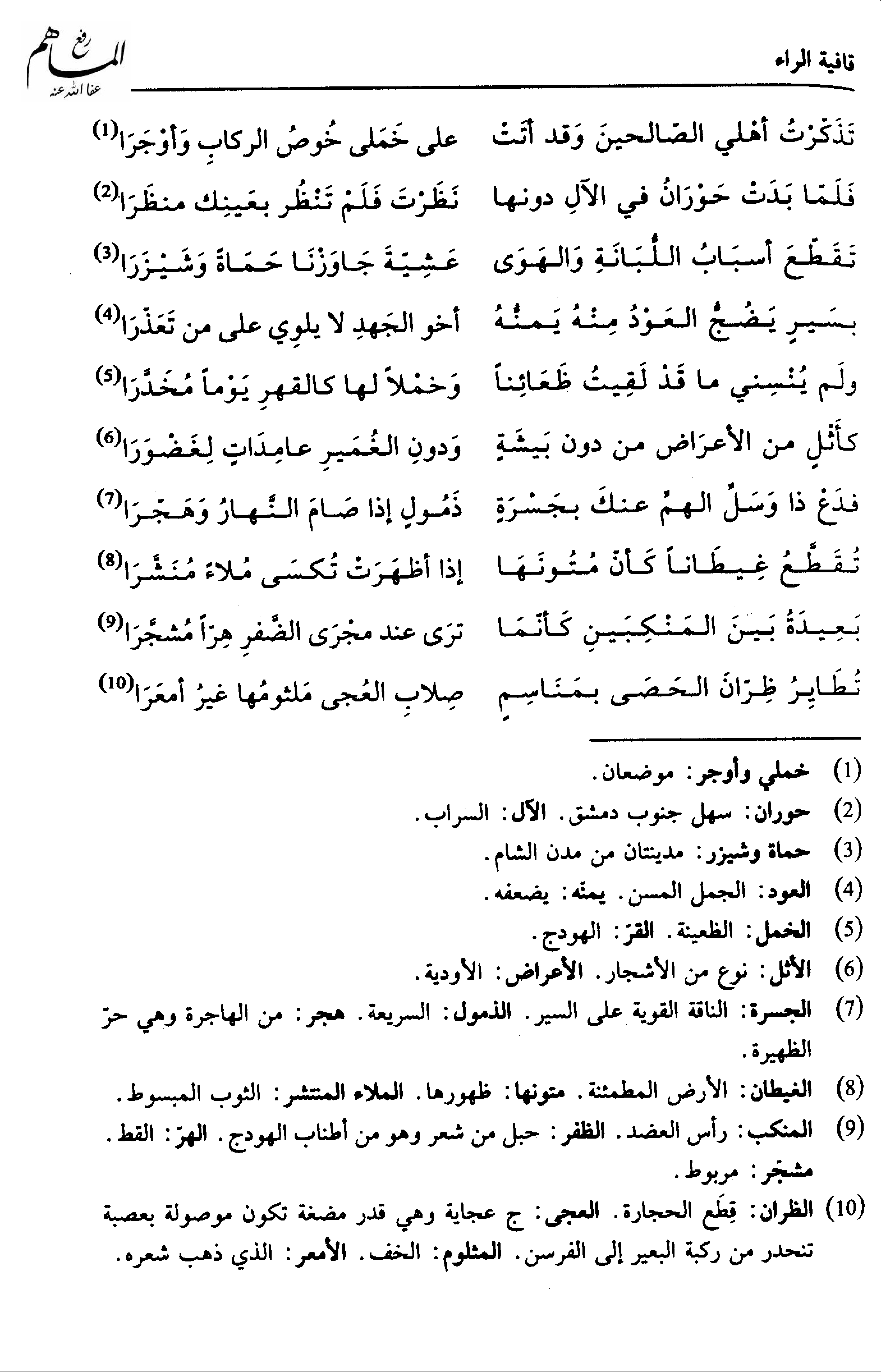 (¬10) الظران: قِطَع الحجارة. العجى: ج عجاية وهي قدر مضغة تكون موصولة بعصبة تنحدر من ركبة البعير إلى الفرسن. المثلوم: الخف. الأمعر: الذي ذهب شعره.