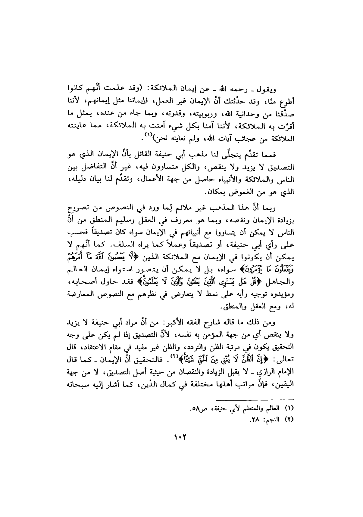ومن ذلك ما قاله شارح الفقه الأكبر: من أن مراد أبي حنيفة لا يزيد ولا ينقص أي من جهة المؤمن به نفسه، لأن التصديق إذا لم يكن على وجه التحقيق يكون في مرتبة الظن والتردد، والظن غير مفيد في مقام الاعتقاد، قال تعالى: {إِنَّ الظَّنَّ لا يُغْنِي مِنَ الْحَقِّ شَيْئا} 2. فالتحقيق أن الإيمان ـ كما قال الإمام الرازي ـ لا يقبل الزيادة والنقصان من حيثية أصل التصديق، لا من جهة اليقين، فإن مراتب أهلها مختلفة في كمال الدين، كما أشار إليه سبحانه