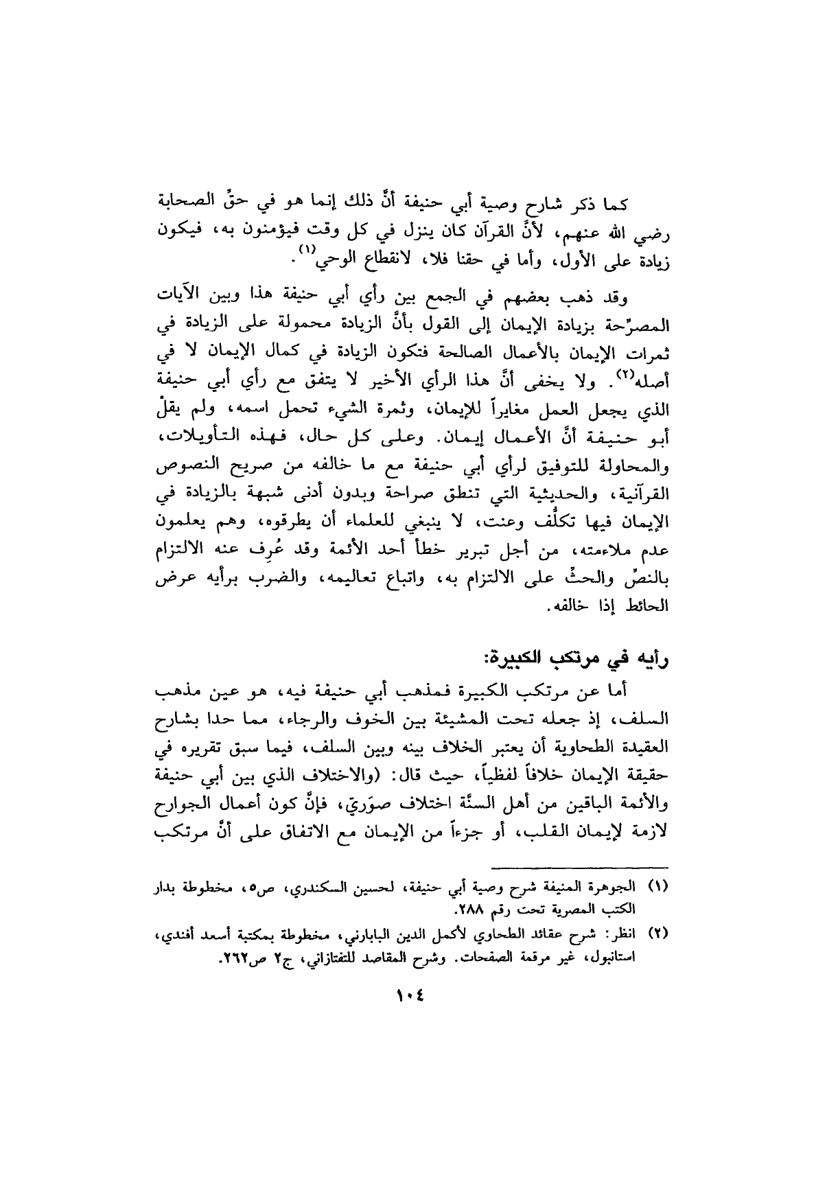 وقد ذهب بعضهم في الجمع بين رأي أبي حنيفة هذا وبين الآيات المصرحة بزيادة الإيمان إلى القول بأن الزيادة محمولة على الزيادة في ثمرات الإيمان بالأعمال الصالحة فتكون الزيادة في كمال الإيمان لا في أصله 2. ولا يخفى أن هذا الرأي الأخير لا يتفق مع رأي أبي حنيفة الذي يجعل العمل مغايراً للإيمان، وثمرة الشيئ تحمل اسمه، ولم يقلْ أبو حنيفة أن الأعمال إيمان. وعلى كل حال، فهذه التأويلات، والمحاولة للتوفيق لرأي أبي حنيفة مع ما خالفه من صريح النصوص القرآنية، والحديثية التي تنطق صراحة وبدون أدنى شبهة بالزيادة في الإيمان فيها تكلُّف وعنت، لا ينبغي للعلماء أن يطرقوه، وهم يعلمون عدم ملاءمته، من أجل تبرير خطأ أحد الأئمة وقد عُرِف عنه الالتزام بالنص والحثِّ على الالتزام به، واتباع تعاليمه، والضرب برأيه عرض الحائط إذا خالفه.