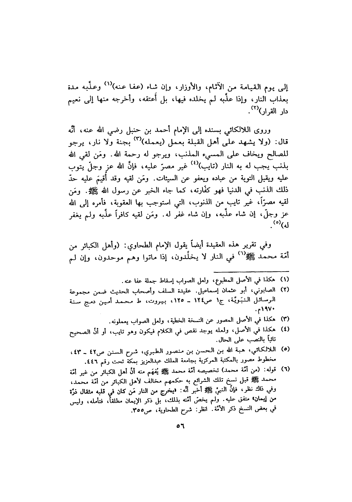 وفي تقرير هذه العقيدة أيضاً يقول الإمام الطحاوي: " وأهل الكبائر من أمة محمد صلى الله عليه وسلم 6 في النار لا يخلدون، إذا ماتوا وهم موحدون، وإن لم
