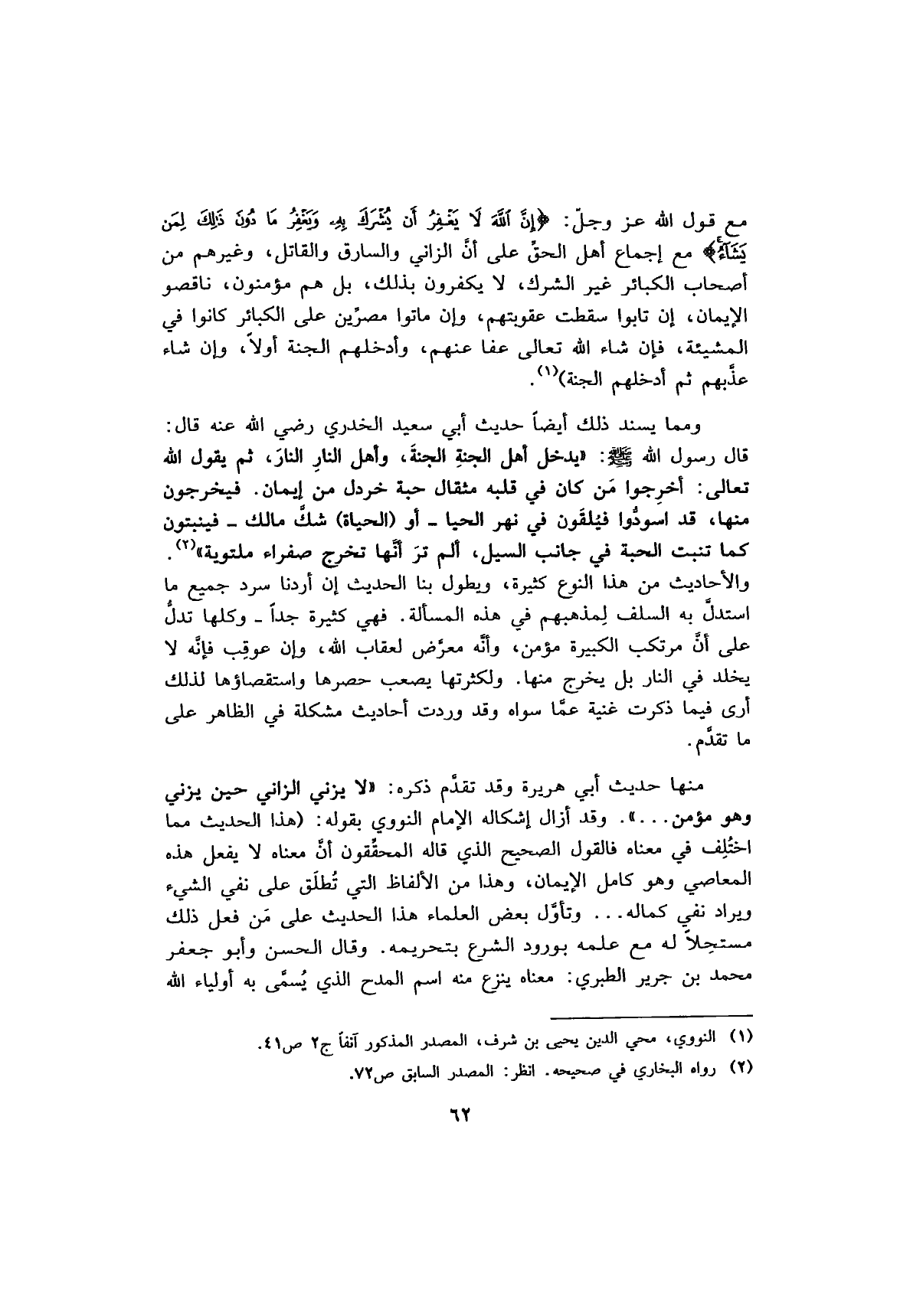 مع قول الله عز وجل: {إِنَّ اللَّهَ لا يَغْفِرُ أَنْ يُشْرَكَ بِهِ وَيَغْفِرُ مَا دُونَ ذَلِكَ لِمَنْ يَشَاءُ} مع إجماع أهل الحق على أن الزاني والسارق والقاتل، وغيرهم من أصحاب الكبائر غير الشرك، لا يكفرون بذلك، بل هم مؤمنون، ناقصو الإيمان، إن تابوا سقطت عقوبتهم، وإن ماتوا مصرِّين على كبائر كانوا في المشيئة، فإن شاء الله تعالى عفا عنهم، وأدخلهم الجنة أولاً، وإن شاء عذبهم ثم أدخلهم الجنة " 1.
