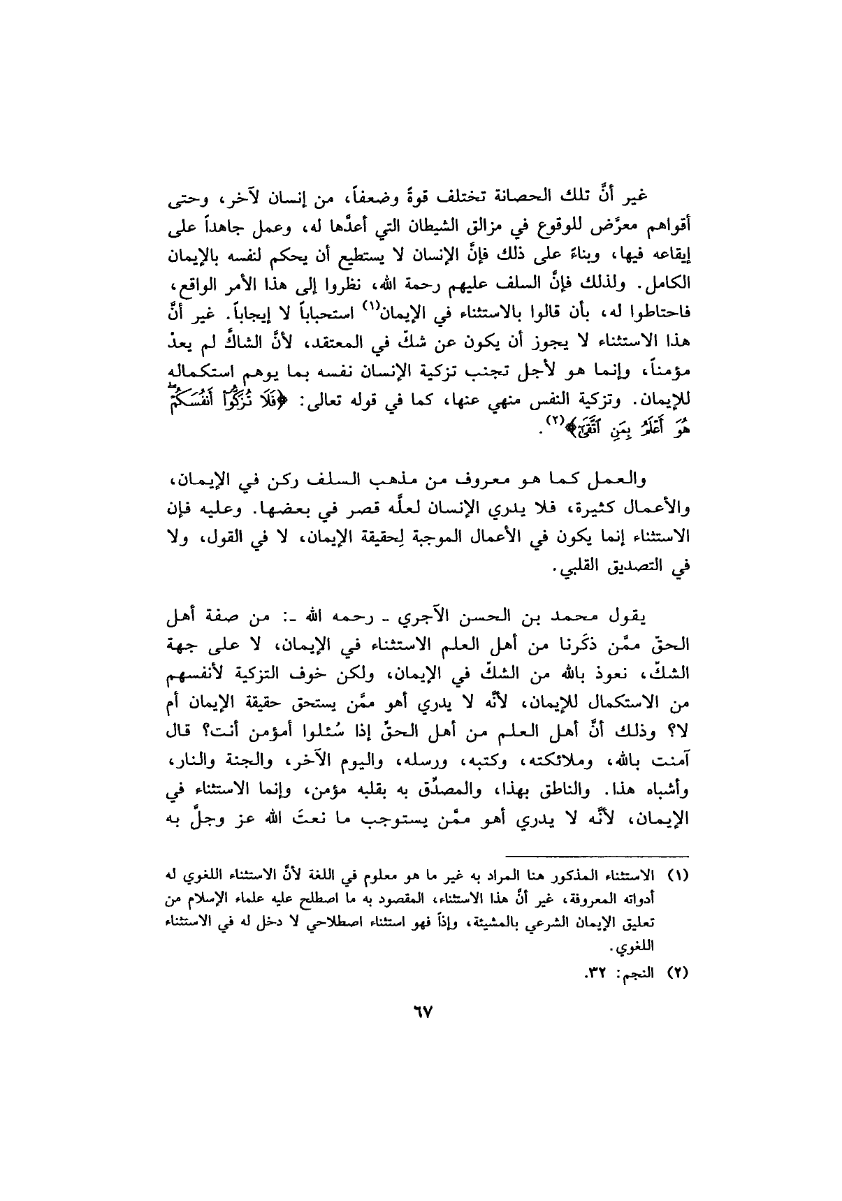 غير أن تلك الحصانة تختلف قوة وضعفاً، من إنسان لآخر، وحتى أقواهم معرَّض للوقوع في مزالق الشيطان التي أعدها له، وعمل جاهداً على إيقاعه فيها، وبناءً على ذلك فإن الإنسان لا يستطيع أن يحكم لنفسه بالإيمان الكامل. ولذلك فإن السلف عليهم رحمة الله، نظروا إلى هذا الأمر الواقع، فاحتاطوا له، بأن قالوا بالاستثناء في الإيمان1 استحباباً لا إيجاباً. غير أن هذا الاستثناء لا يجوز أن يكون عن شكّ في المعتقد، لأن الشاكَّ لم يعدْ مؤمناً، وإنما هو لأجل تجنب تزكية الإنسان نفسه بما يوهم استكماله للإيمان. وتزكية النفس منهي عنها، كما في قوله تعالى: {فَلا تُزَكُّوا أَنْفُسَكُمْ هُوَ أَعْلَمُ بِمَنِ اتَّقَى} 2.